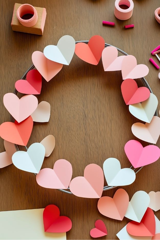 I like the paper hearts on this wreath more than I expected, they’re so simple, but they look adorable all lined up together. The soft mix of pinks and neutrals gives it that sweet, handmade feel without trying too hard. It’s the kind of project you can pull together with just paper and a pair of scissors, yet it still looks thoughtful once it’s on the wall.