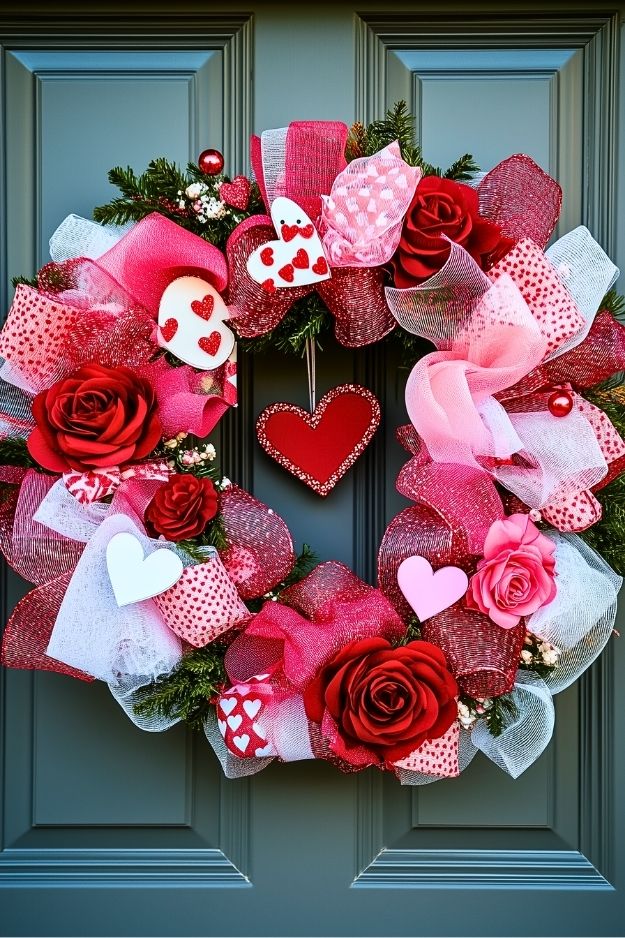 This wreath goes all-in on the classic Valentine look, and honestly, it’s kind of fun seeing someone lean into the bold reds and pinks without holding back. The mix of mesh ribbons, faux roses, and little heart cutouts makes it feel big and festive, like something you’d spot on a house that takes holidays seriously. I like the hanging heart in the center too — it gives the whole design a focal point.