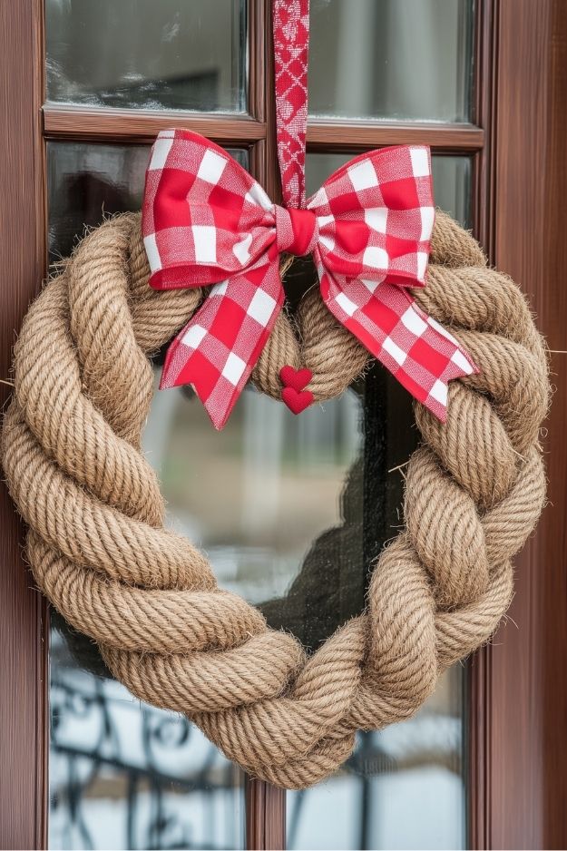 There’s something so charming about this heart wreath, and it leans into a totally different vibe from the first one. The thick braided rope gives it this cozy, handmade feel without trying too hard, the kind of thing you’d spot on a farmhouse porch when it’s still chilly outside.
