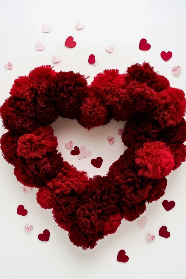 I swear this pom-pom wreath might be the fluffiest thing I’ve ever seen, and it somehow makes the whole idea of Valentine’s decor feel fun again. All those deep red pom poms create the softest, cloud-like texture, and the mix of sizes keeps it from looking flat. It’s one of those projects that seems complicated until you realize it’s mostly yarn, cardboard, and a little patience.