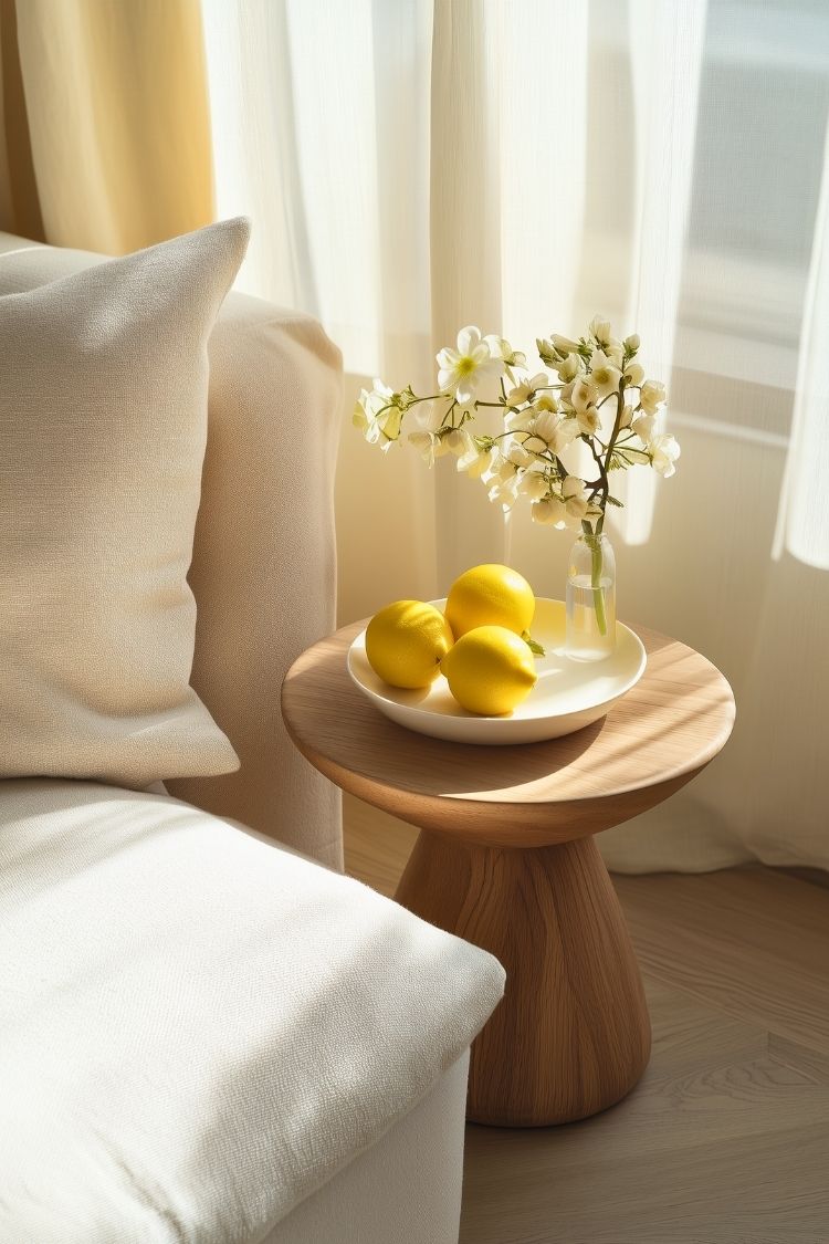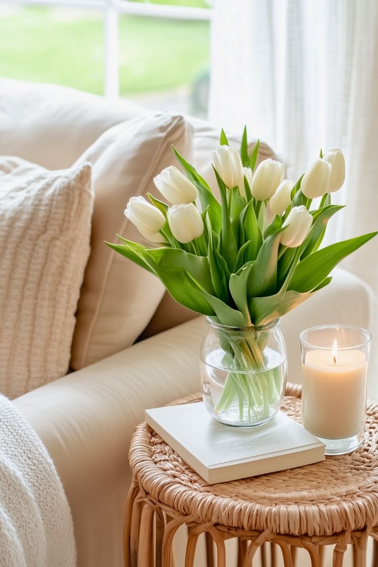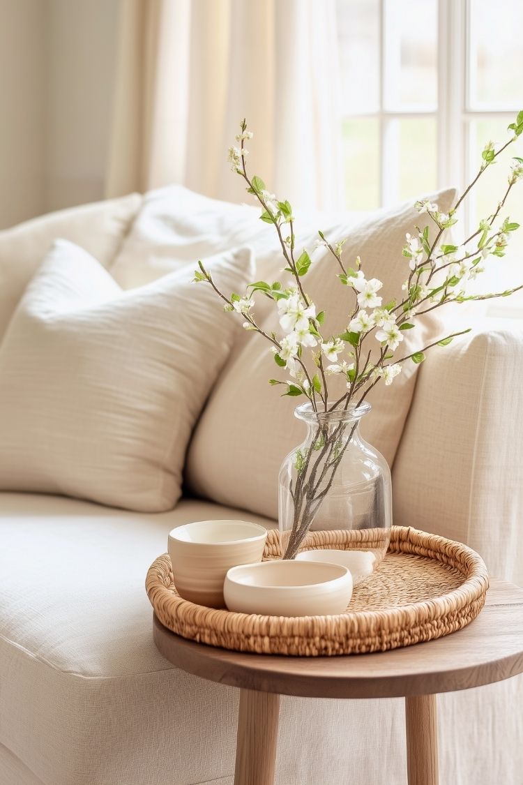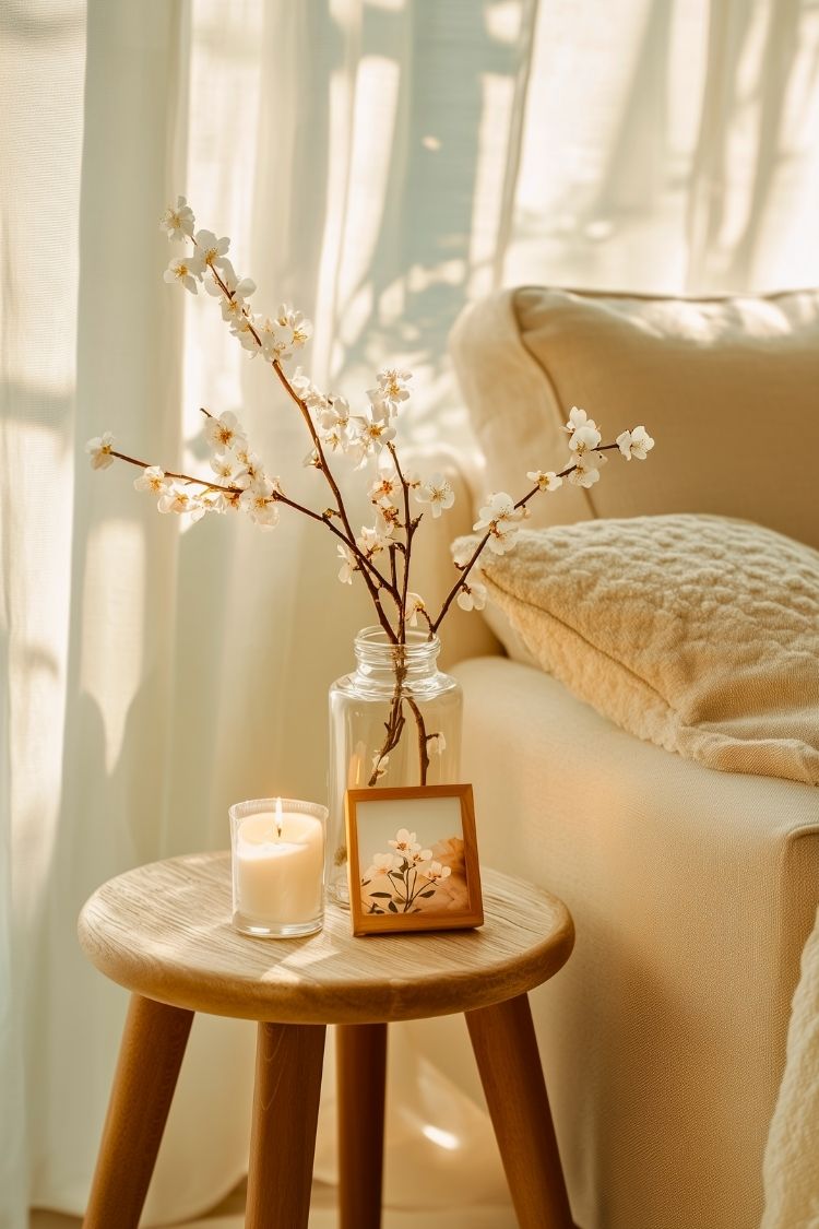Have you got any idea so far? This one is another side table setup that feels clean, natural, and quietly beautiful. It feels like you’ve brought a little piece of the morning garden straight into the living room. I like how the soft sunlight hits the water in the vase, too, giving the whole setup a really gentle glow.