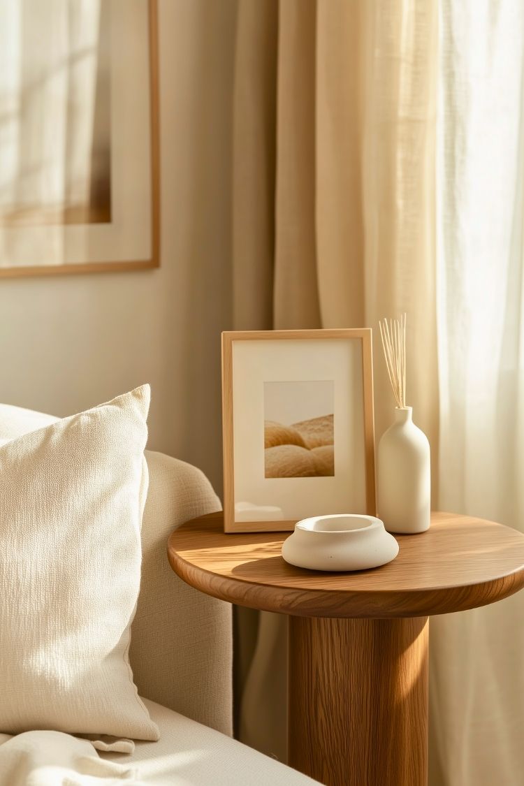 I just really like to have my living room smell good all spring; therefore, this kind of setup for the side table just got me for the first time I saw it. The matte vase with reed diffusers adds that clean, spa-like scent that instantly makes a room feel lighter, and the small ceramic bowl keeps the whole setup grounded and simple.