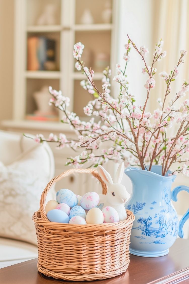 If you’re a fan of the Easter Holiday, you couldn’t miss this idea. A basket of pastel eggs instantly wakes a room up after winter, and this little setup does it so effortlessly. The soft blues, creams, and pinks look even fresher next to the tall blue pitcher overflowing with cherry-blossom branches.