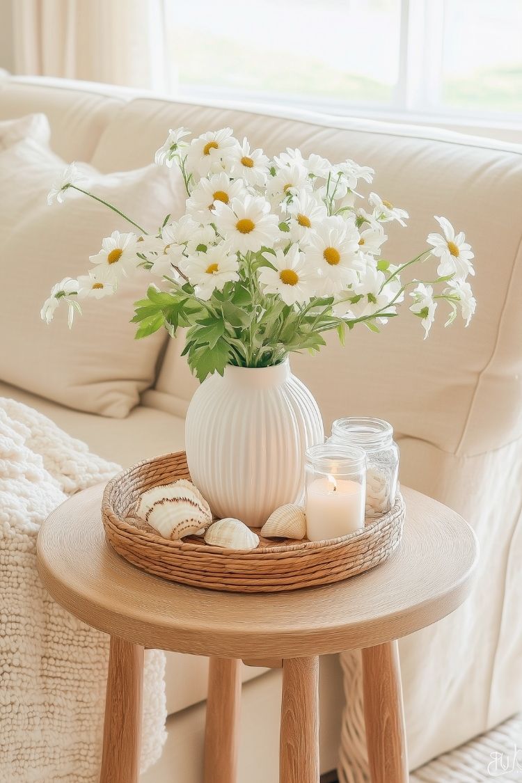 A setup like this always feels like the start of a slow, sunny morning. The soft blush and white flowers bring that breezy spring charm, but the seashells are what make it special. They add a quiet coastal note without turning the whole space beach-themed for those who live near the sea or beaches.
