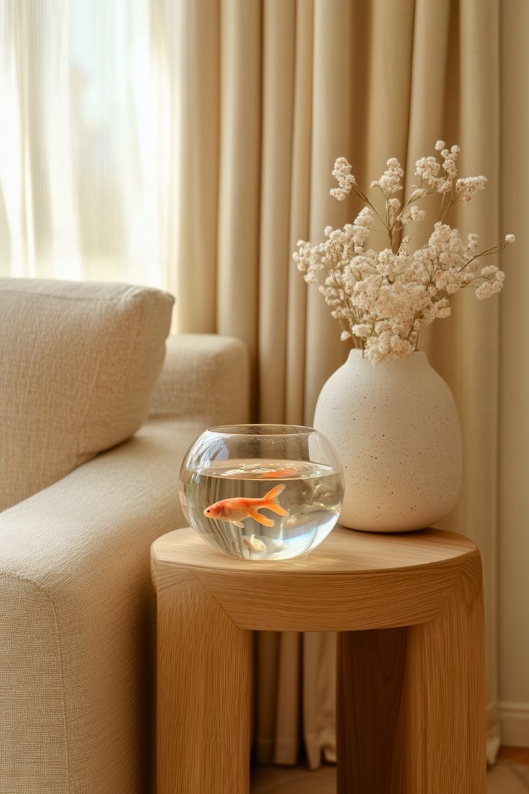 If you’re still finding something new for your living room this season, having a new fish bowl isn’t a great idea, to be honest. The small glass fish bowl feels playful without being kitschy, and the soft orange of the goldfish brings a burst of life against all the warm neutrals in the room. And this setup does so well. It’s a simple idea, but it adds so much personality.