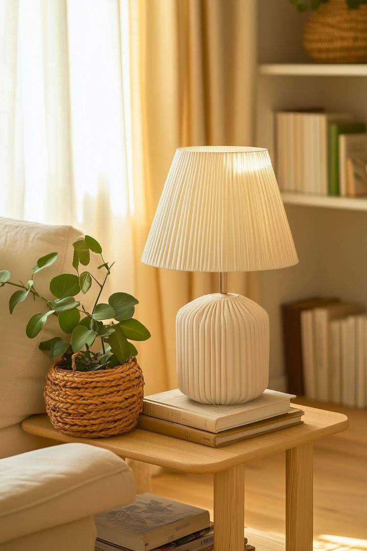 I’m not gonna lie, when saying warm light always feels like the easiest way to invite spring indoors, and this little setup proves it. The pleated lamp adds such a soft glow, especially paired with the natural wood table and the woven plant basket. I’m impressed with the book’s setup, which is part decoration and part riser to give the lamp a bit more presence.