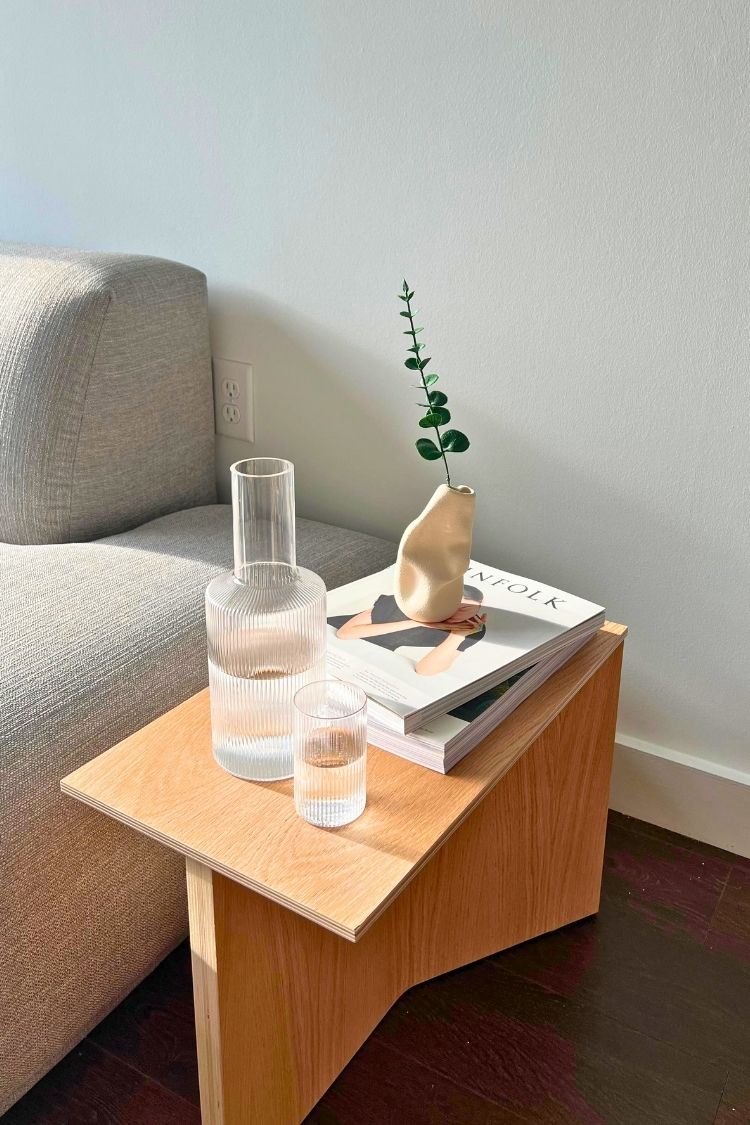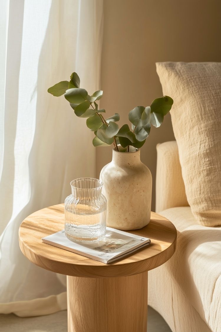 Here’s another decoration idea for your side table setup with plants and glasses. A sculptural vase with a simple eucalyptus stem, a clear carafe that catches the sun, and a small stack of magazines keep the table feeling curated without being fussy.