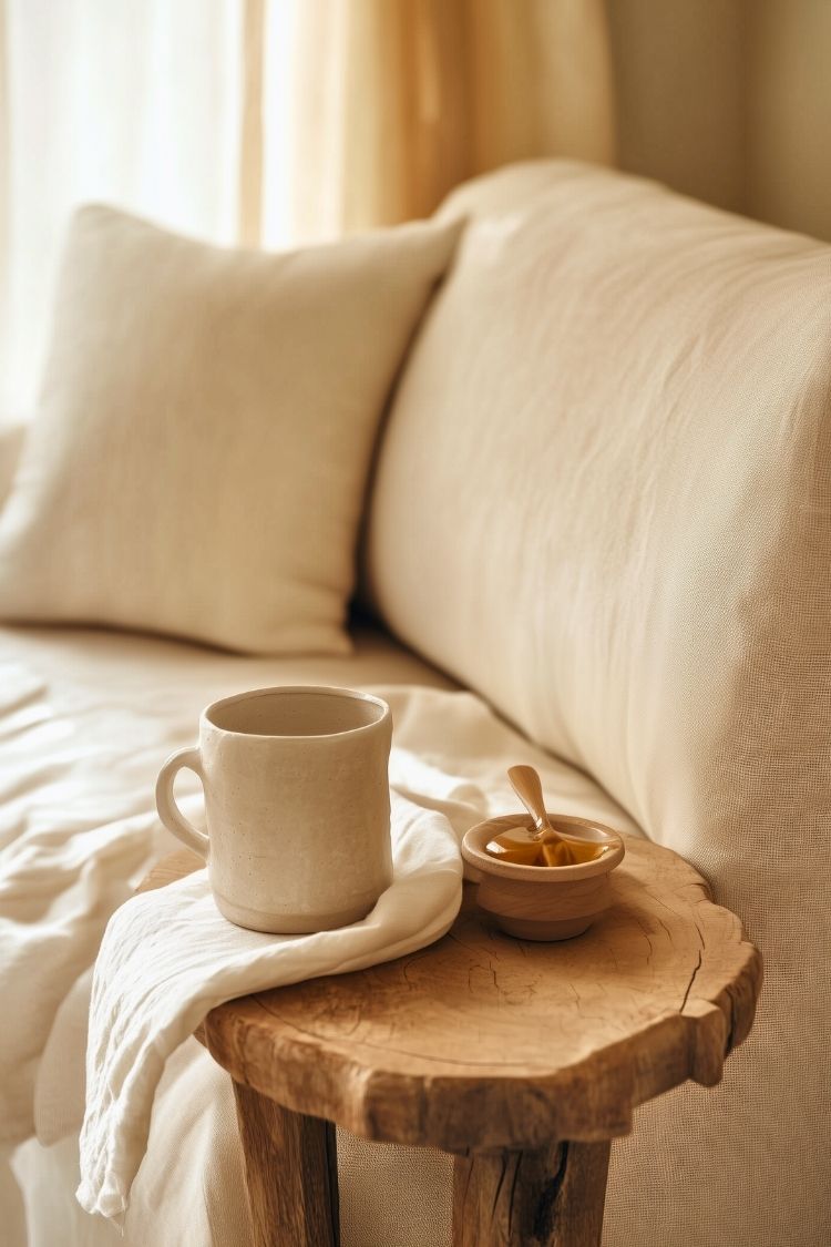 I love how this little corner feels like the first slow morning of spring. Why do we always need to have flowers to make our corner look more spring-like, right? This rustic setup proves that with just a handmade mug and a tiny honey pot, you could feel like the spring season is gently knocking on your door.