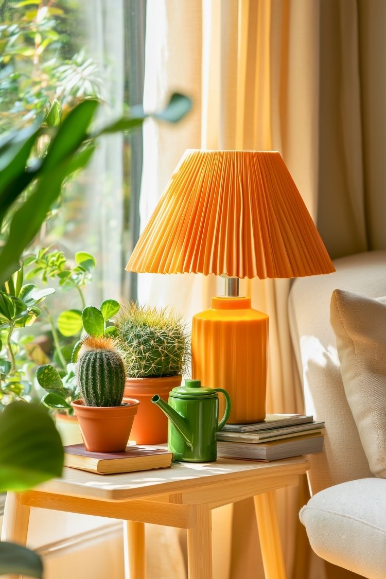 It’s so cheerful about a side table when it leans fully into color and plants. The bright orange lamp definitely steals the attention and gives everything that late-afternoon glow. The mix of cacti, succulents, and even the tiny one tucked into the watering can makes the whole setup feel playful.