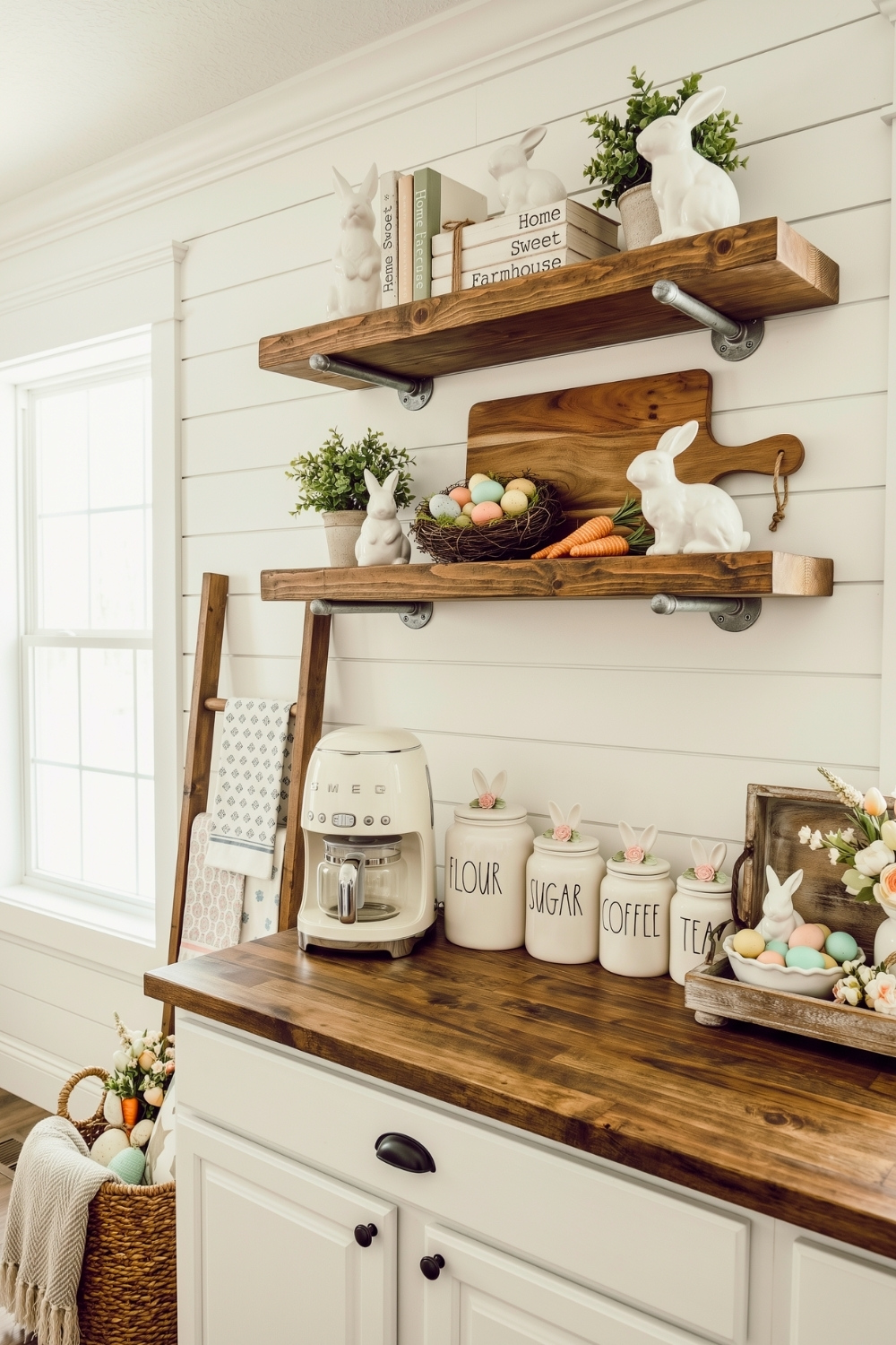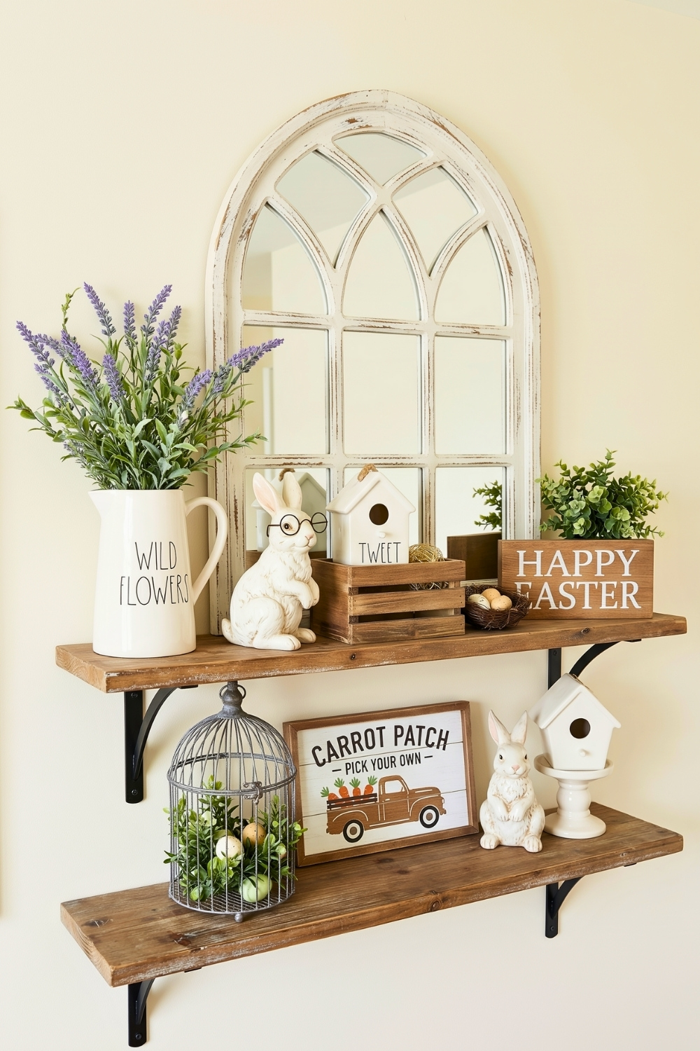 I think this setup feels incredibly homey because it leans into that relaxed farmhouse charm we all love. This is such a smart on a budget idea since you can use many items you already own or add easy DIY touches. Using layered shelves is a clever way to fill up vertical space without crowding your actual table. This gives you plenty of room for your bunny figures and soft colors.