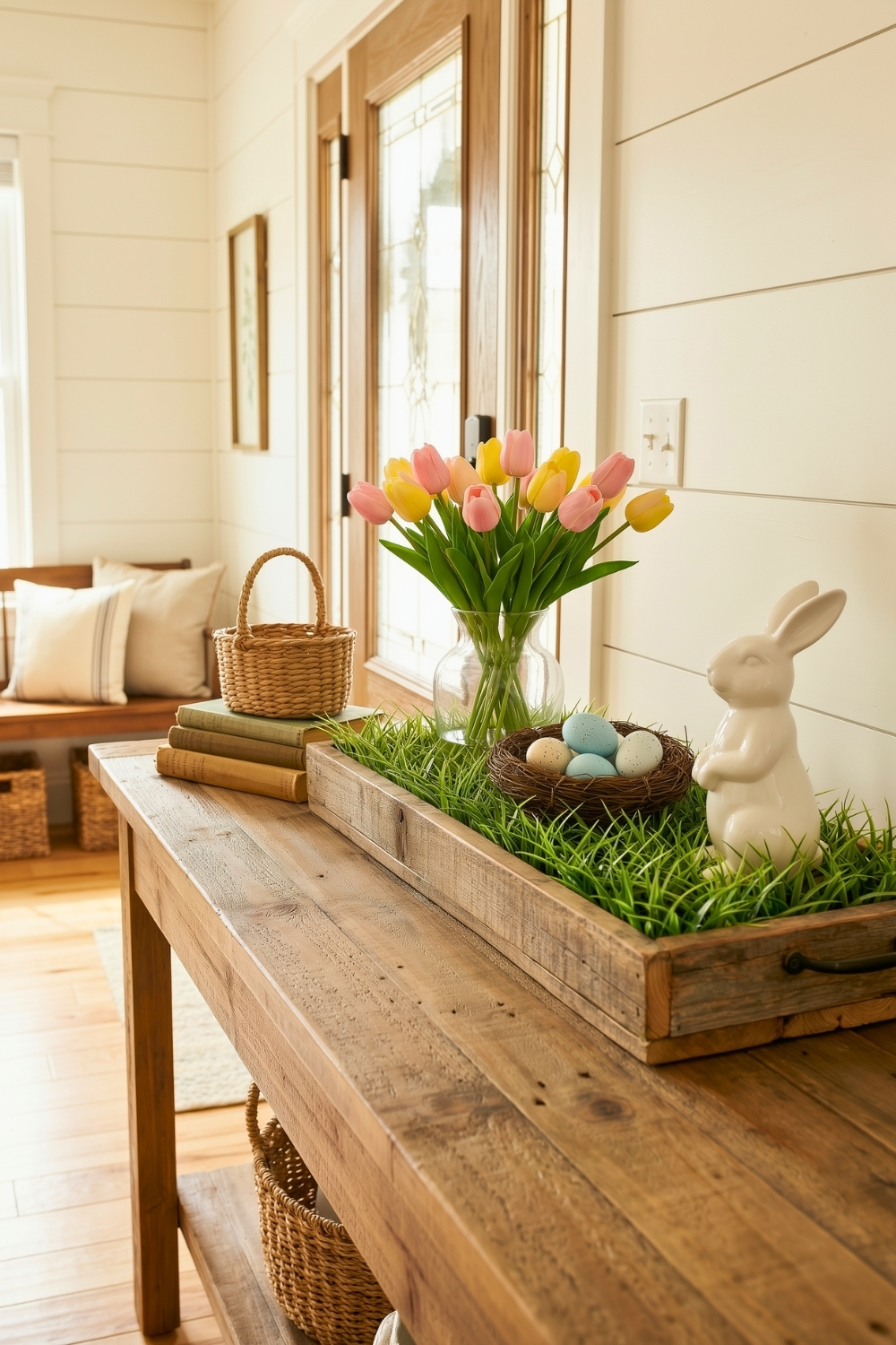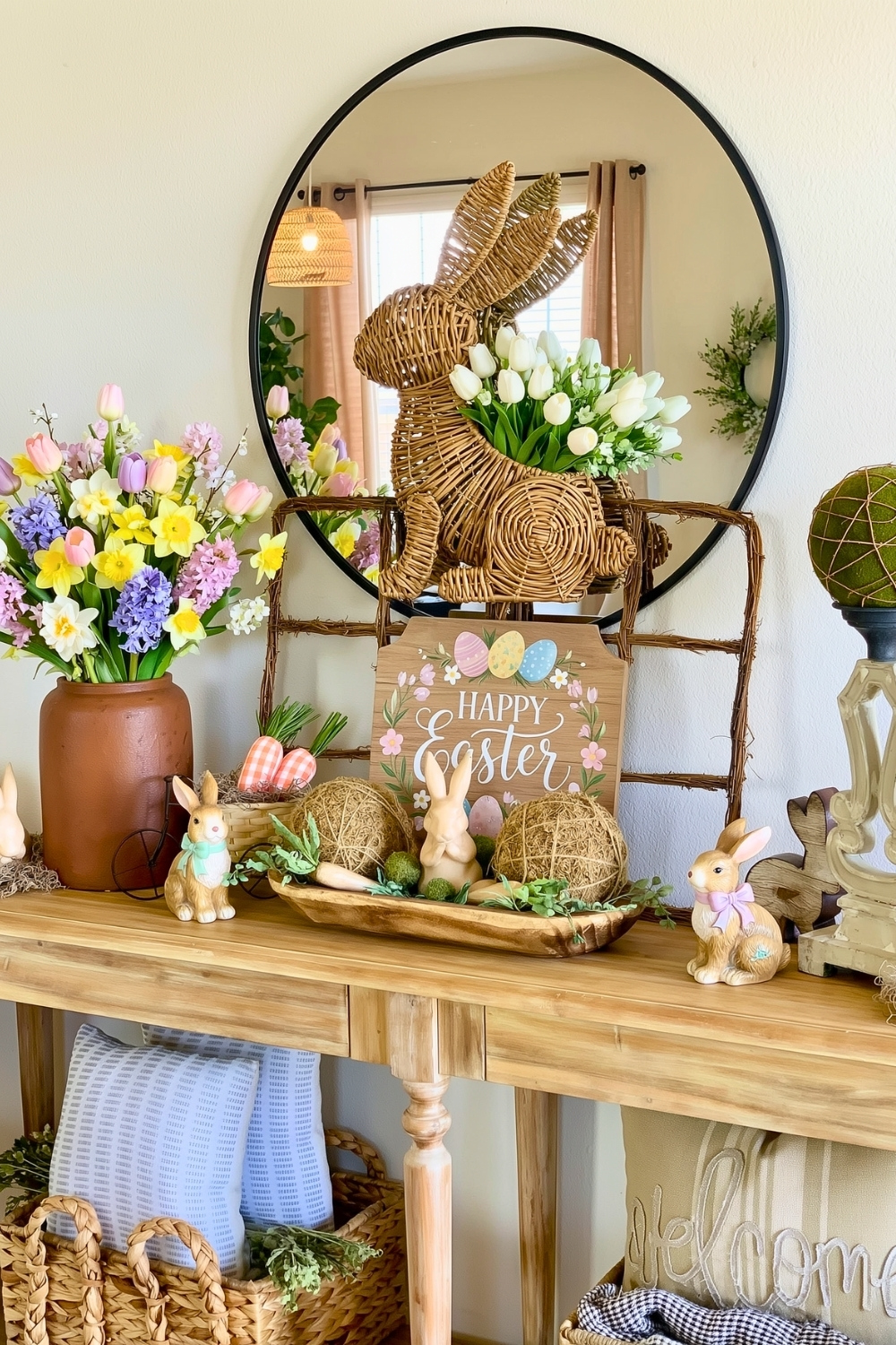 I honestly love how this first setup feels so welcoming, especially if you’re a fan of that classic farmhouse look. The woven bunny paired with springtime flowers creates a soft, simple focal point that looks beautiful on a foyer table. You won’t have to worry about the space feeling cluttered with this approach. This idea is a winner if you want Easter decor that feels seasonal but stays neutral enough to match your existing style.