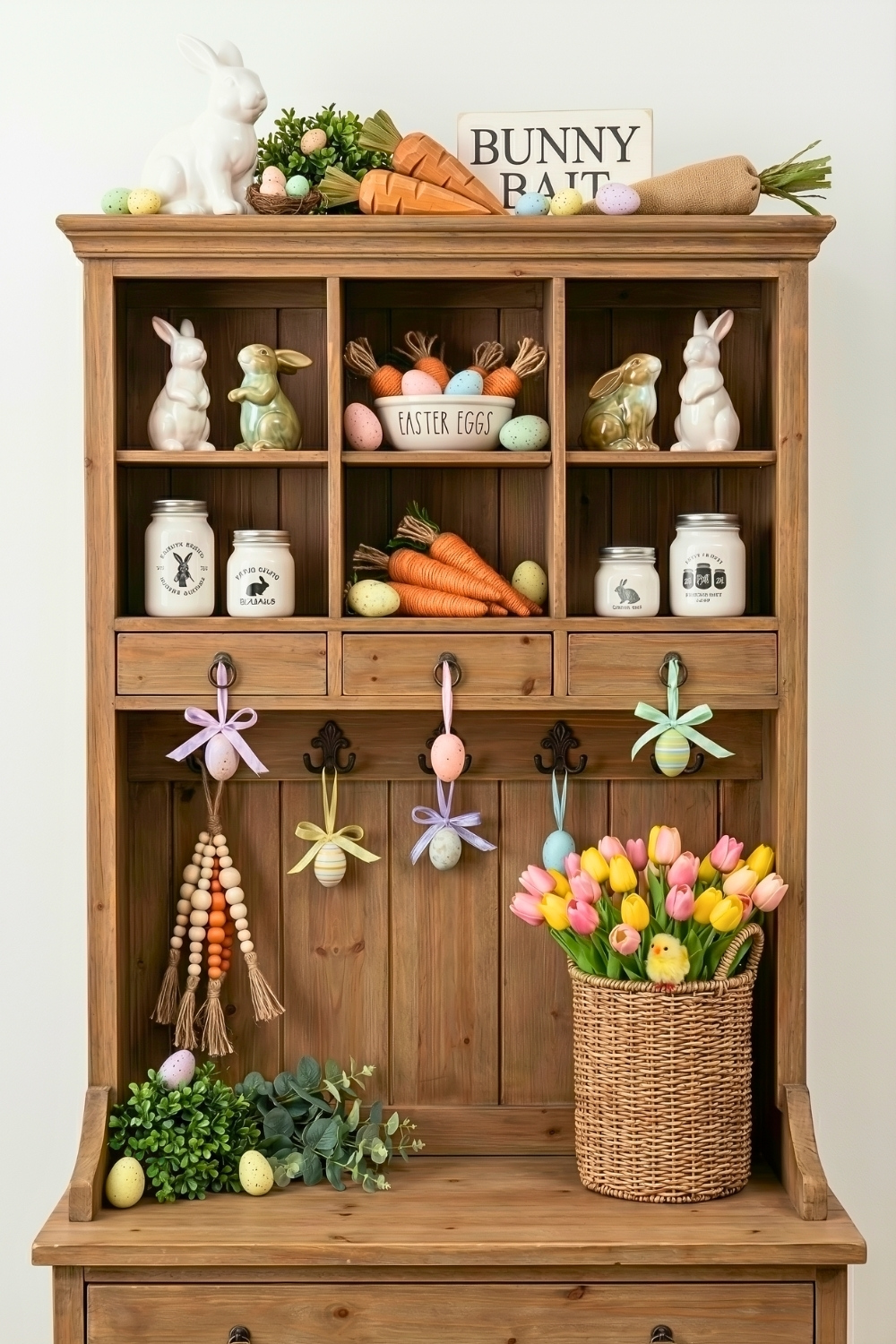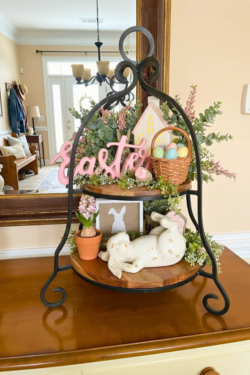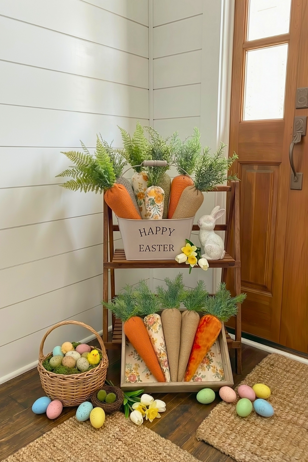 I also love how a tiered tray can bring instant farmhouse charm to your entryway without making it feel messy. Combining bunny accents with little carrots creates a look that is both festive and simple. This is an excellent choice for small spaces where you want a big impact in a tiny footprint. You can easily turn this into a DIY project on a budget by using things you already have at home.