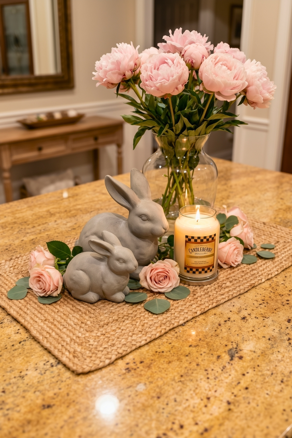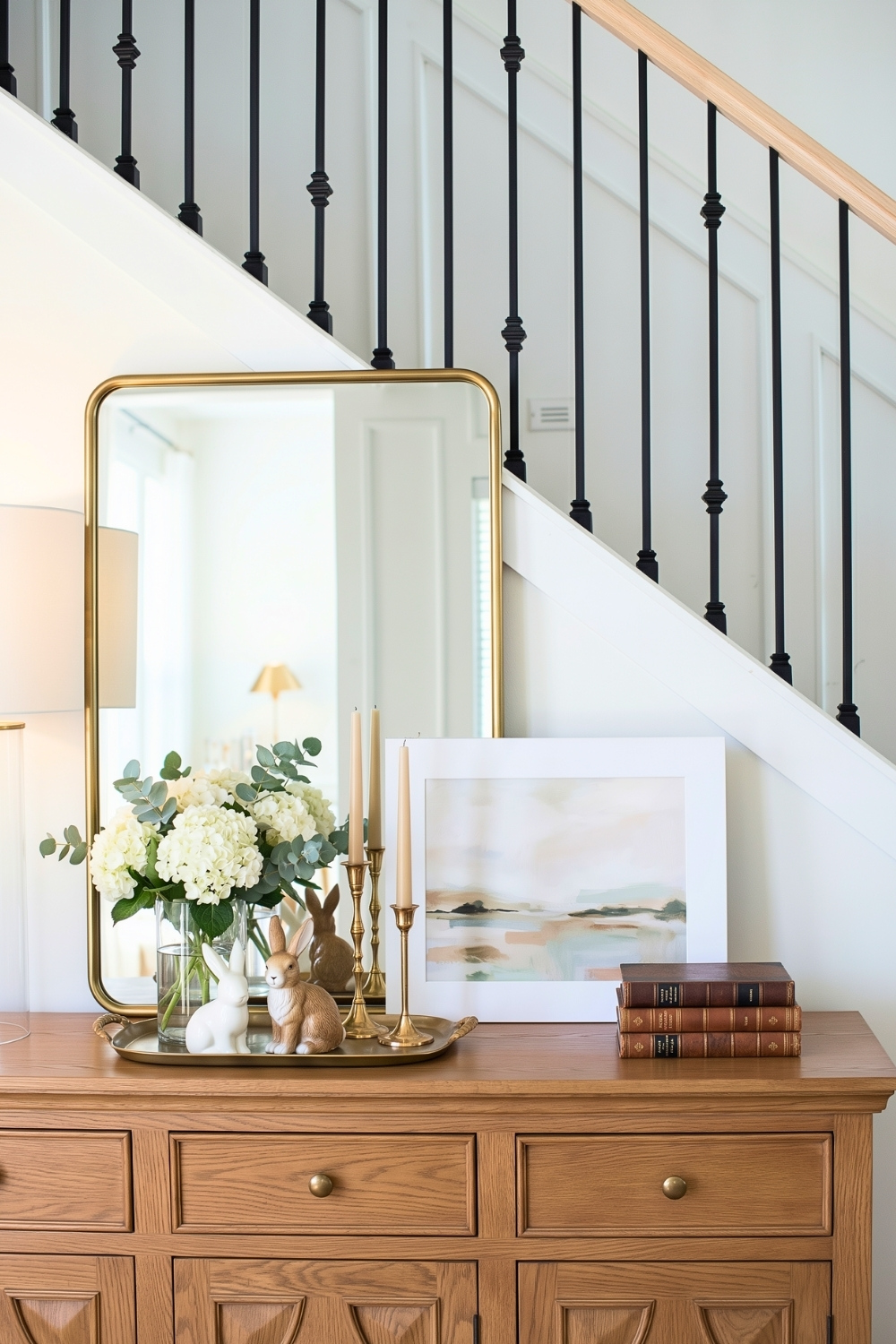 I love how blush flowers and a simple bunny figurine can instantly soften a room. This farmhouse and springtime look is perfect for a foyer table when you want things to feel calm and inviting. This idea solves the “too empty or too busy” problem by keeping the decor balanced and cozy. Adding a bit of candlelight makes the whole space feel even more welcoming.