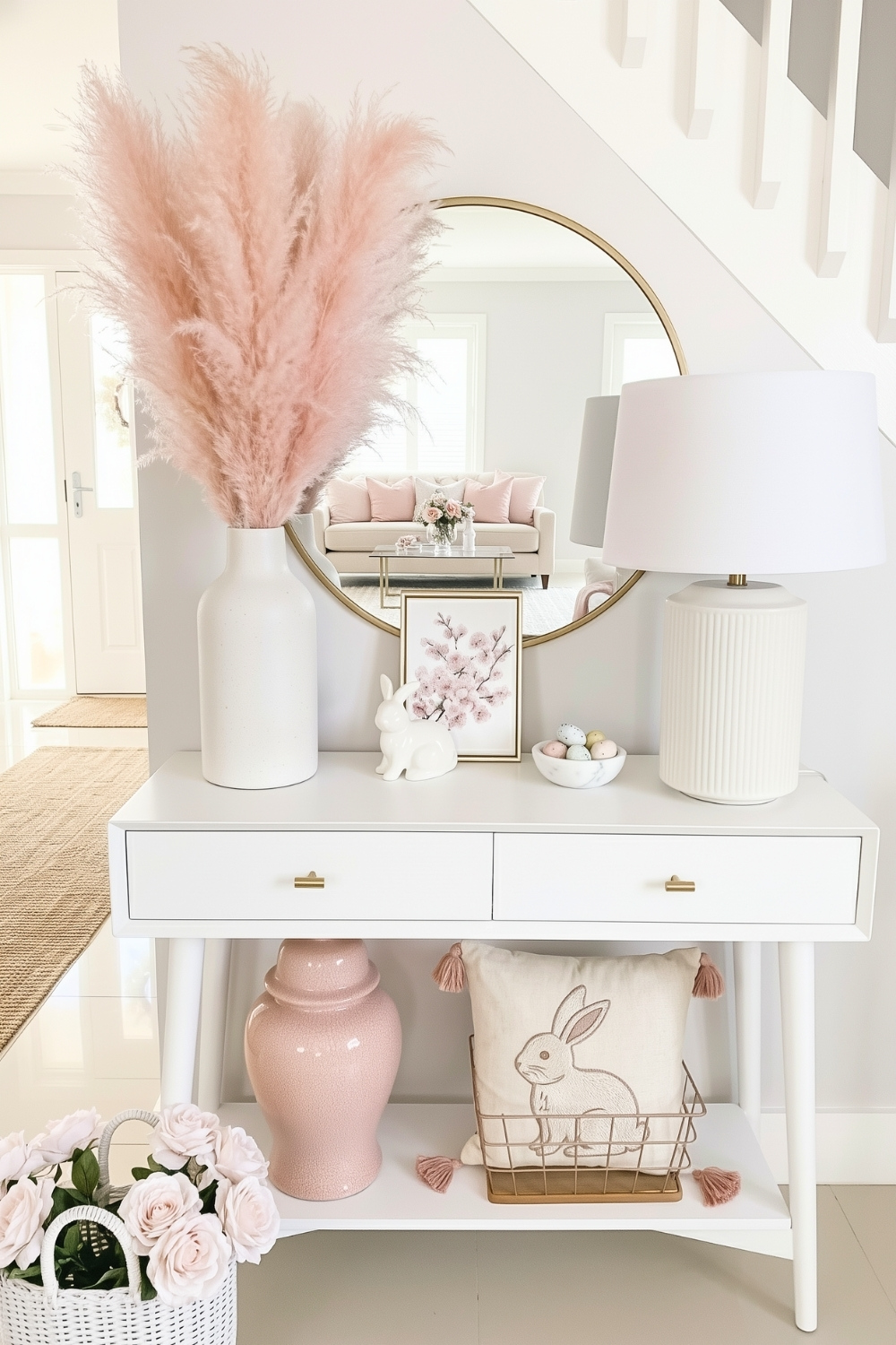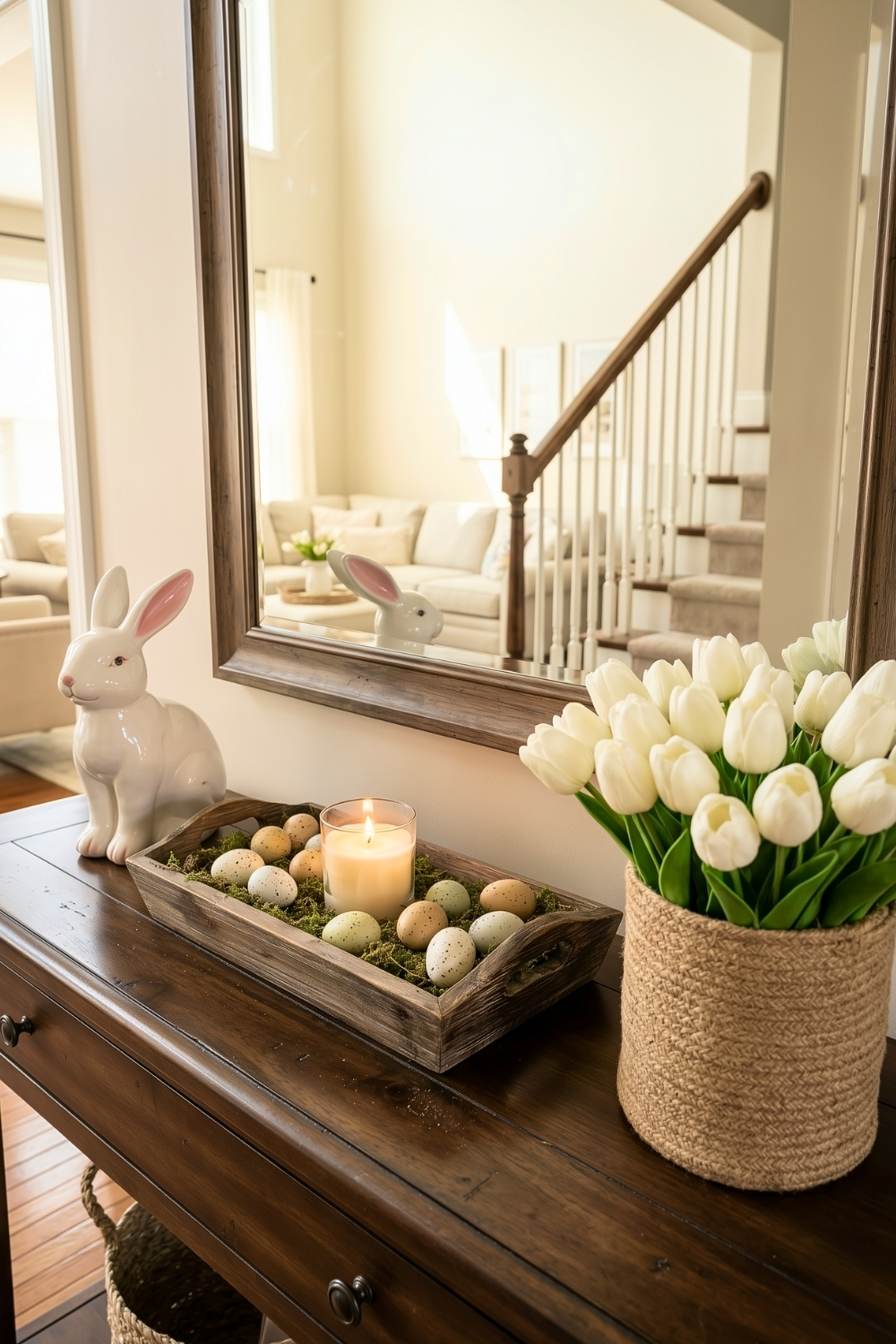 I think this design is ideal if you want your holiday pieces to blend right into your everyday home style. Those bunny statues look subtle and polished, fitting perfectly into a modern or French country entryway. This design proves that spring decor can feel sophisticated and elevated while staying very warm. Your guests will feel the holiday spirit without it feeling like the decorations are taking over the room.