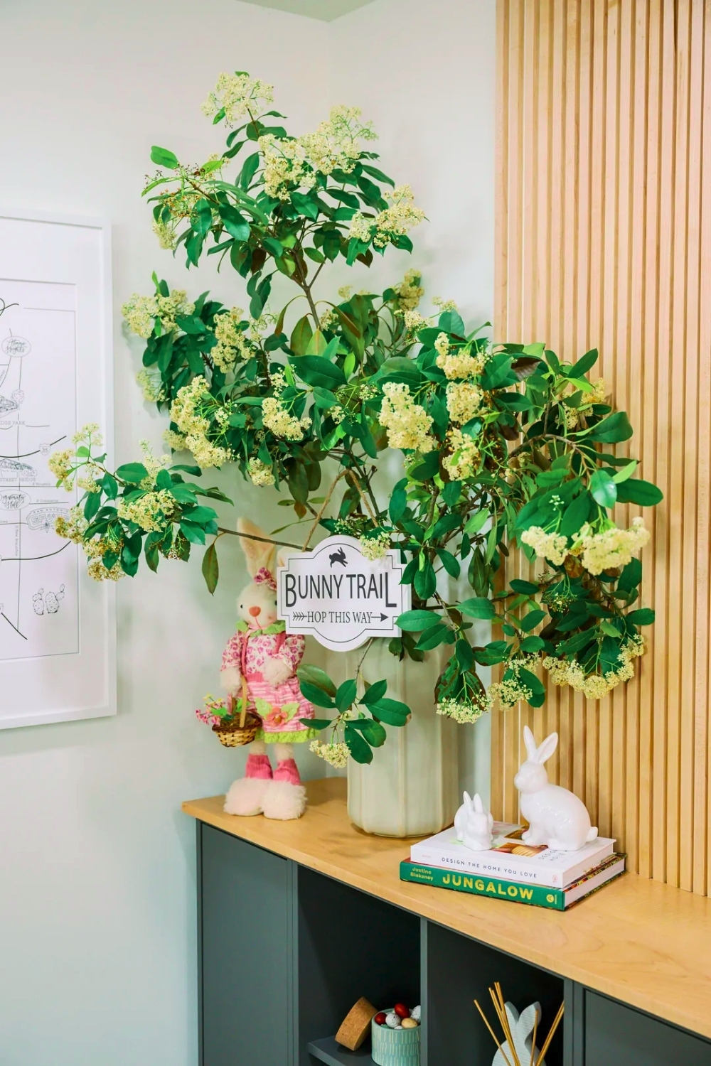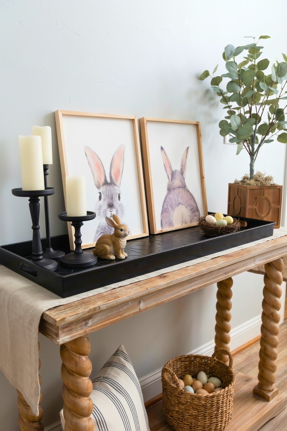 When you’re decorating small spaces, I’ve found that using a tray is a total game-changer for keeping things organized. I really appreciate how the neutral candles and soft bunny art keep the foyer table looking simple and calm for spring. You get all that holiday charm without having to deal with a lot of extra clutter. This is a very practical way to style a narrow surface.