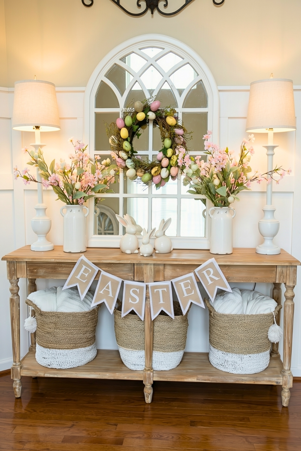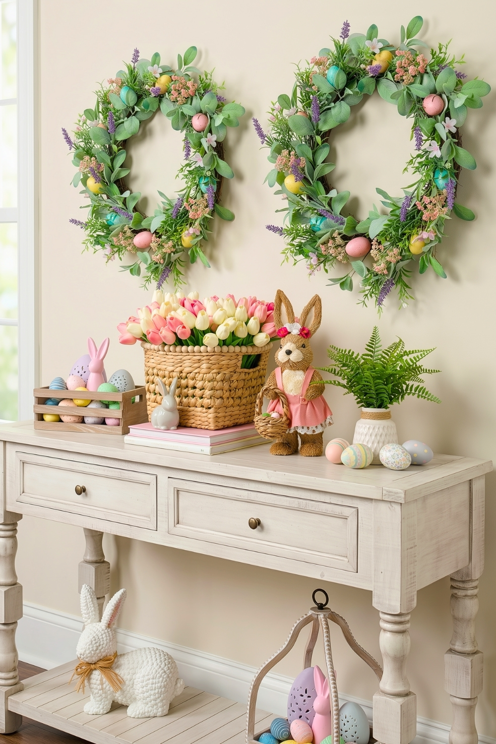 Guests will feel the springtime vibes the moment they walk in with a balanced setup like this one. I like how the matching lamps and the pastel egg wreath turn a standard foyer table into a polished, simple statement. You can achieve this look easily by focusing on symmetry and adding a few bunny accents. These ideas make a big impact without requiring a ton of effort.