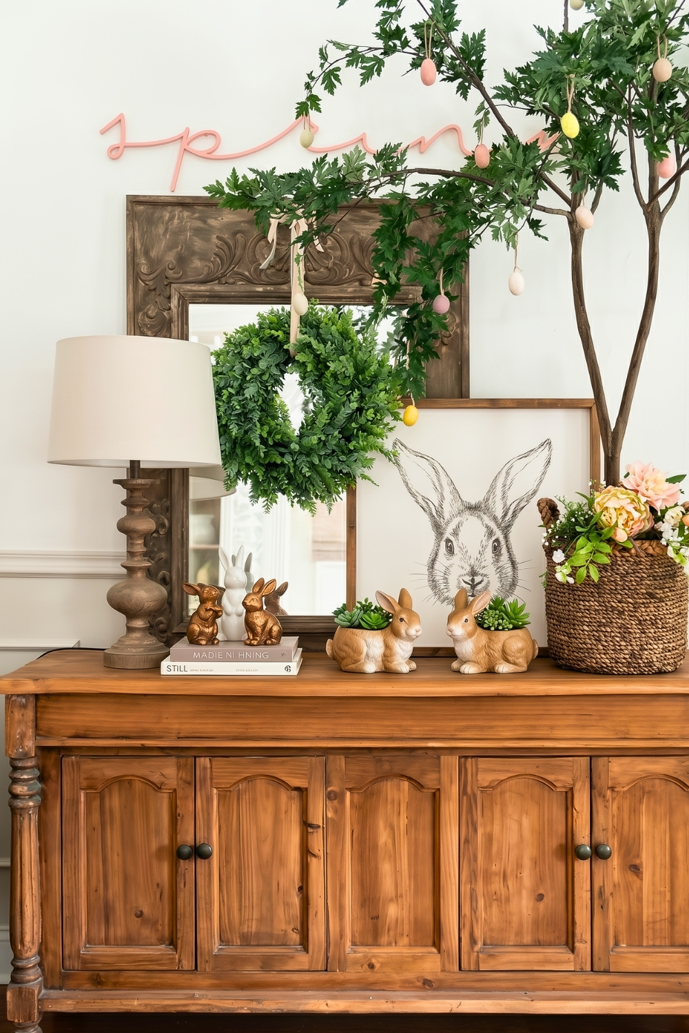 I find this setup to be so playful and fresh, which makes it a fantastic choice for spring DIY projects. Between the greenery wreaths and the colorful eggs, there’s a lot of joy packed into this design. These bunny figures show that you can create a festive entryway while staying on a budget. This is such an approachable way to welcome the new season.