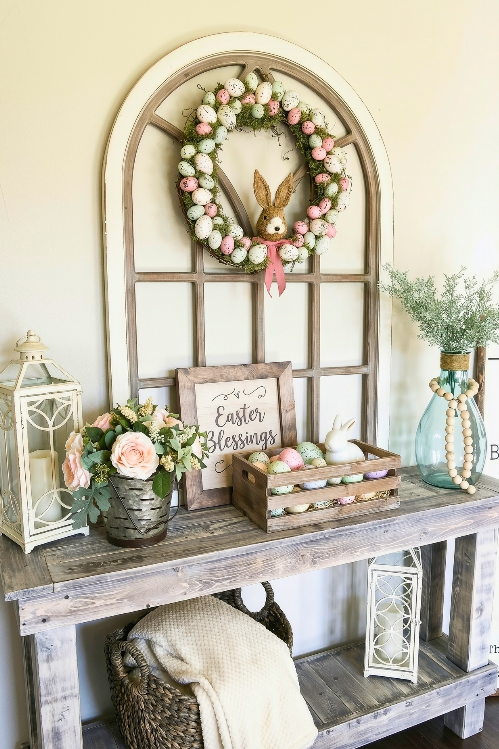 I’m personally a big fan of the vintage feel here, especially that arched window frame. Those soft, neutral tones give off such a lovely French country vibe that I find very relaxing. This idea is perfect if you want your Easter decor to flow naturally with your existing spring home style. You get a seasonal look that doesn’t feel like an “overload.”