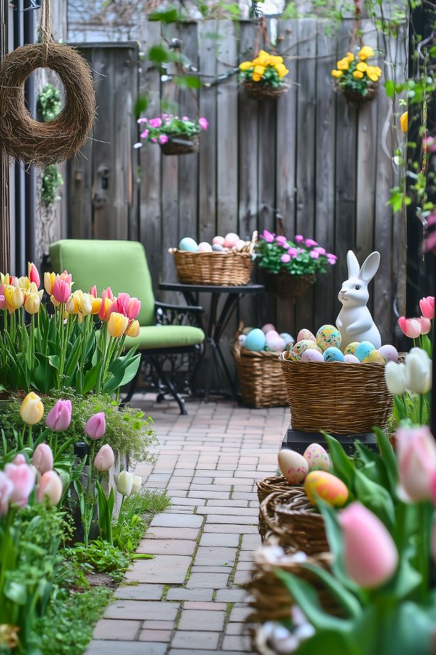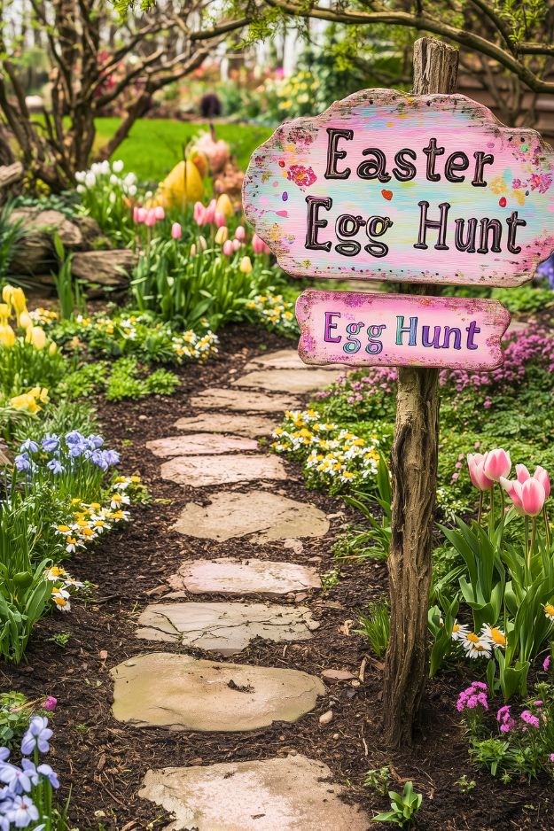 I’m sure the kids will love it when you set up a path like this for an Easter egg hunt. The little sign, the stepping stones, the flowers, they all feel like the start of a tiny adventure. You don’t need much, just a bit of creativity and color to make it look like the perfect trail for some springtime fun.