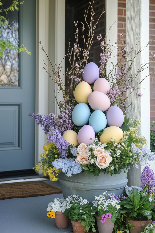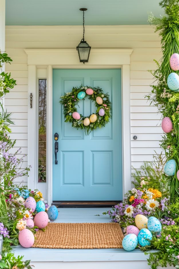 I love how this entryway feels so fresh and inviting, the pastel eggs, the greenery, and that soft blue door just work perfectly together. It’s festive without being too much, like a quiet nod to spring that still makes you smile before you even step inside.