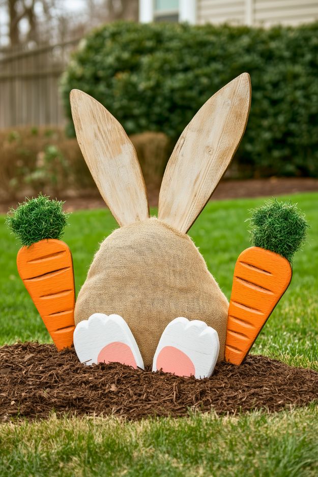 Okay, this one’s hilarious, the little bunny butt diving into the ground gets me every time. It’s such a fun, lighthearted touch for the yard, and honestly, the mix of burlap, wood, and those bright orange carrots makes it even better. It’s like the perfect balance between cute and cheeky.