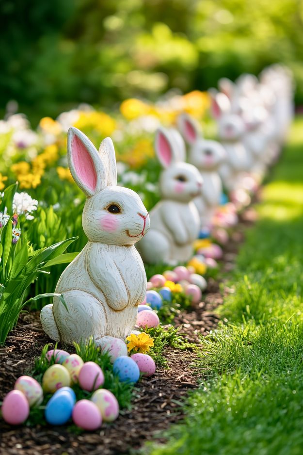 Having bunnies lined up along the garden like this is such a fun and playful touch. Maybe not this many (unless you’re going for full bunny parade vibes), but adding just a few here and there instantly makes the yard feel more welcoming and full of character. It’s the kind of decor that makes people smile as they walk by.