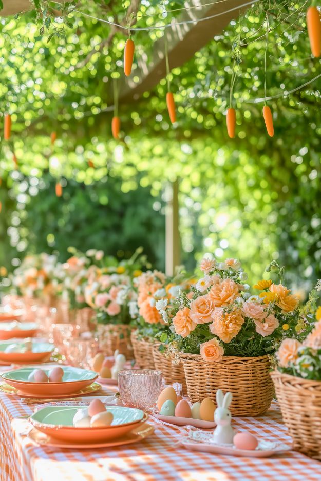 I’d be lowkey jealous if I wasn’t invited to a party like this — it looks like someone just casually put together the prettiest Easter brunch ever. The orange and green combo gives off such cheerful spring vibes, and those pastel eggs pull everything together perfectly. If this were my backyard, I’d honestly be inventing reasons to host brunch every weekend.