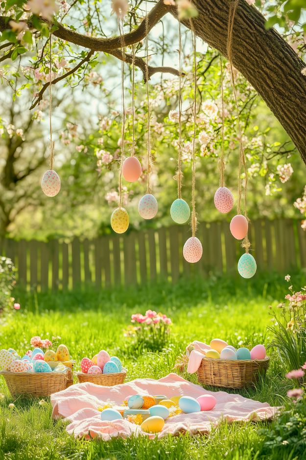 It might not be your usual Easter setup, but there’s something so dreamy about it. The hanging eggs swaying under the tree, the soft blanket, the sunshine, it feels like a scene straight out of a storybook. You could easily turn this into a sweet little picnic spot and just spend the afternoon soaking in the spring air.