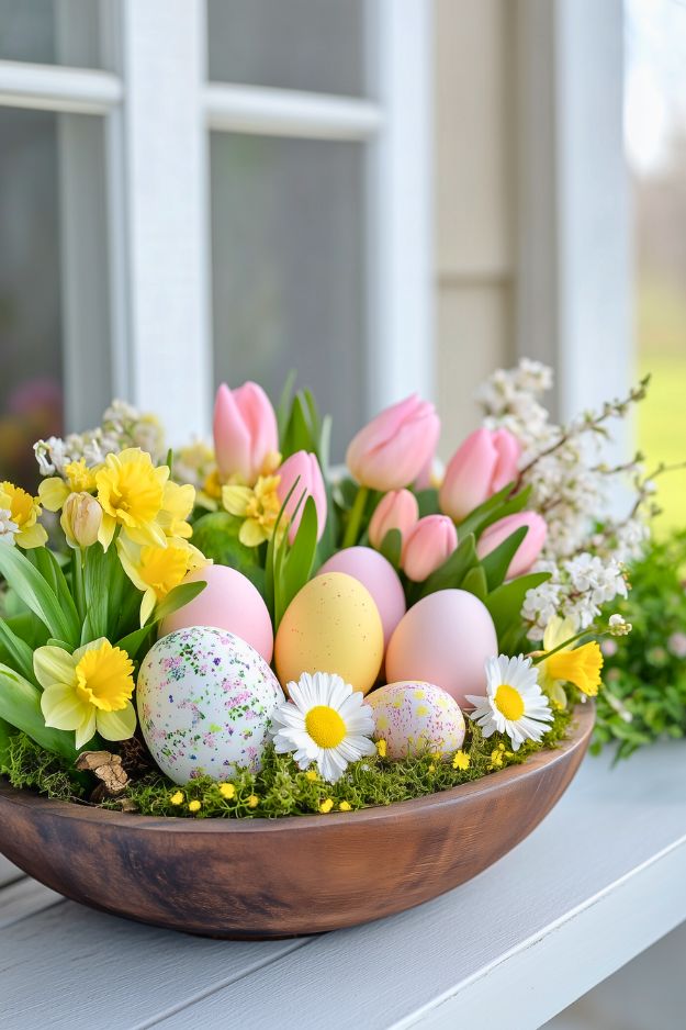A pretty centerpiece like this doesn’t have to stay indoors, it looks just as lovely outside. I like the idea of setting it on a porch table or near a window where the sunlight can hit the tulips and eggs. Sometimes a small detail like this does more than any big decoration ever could.