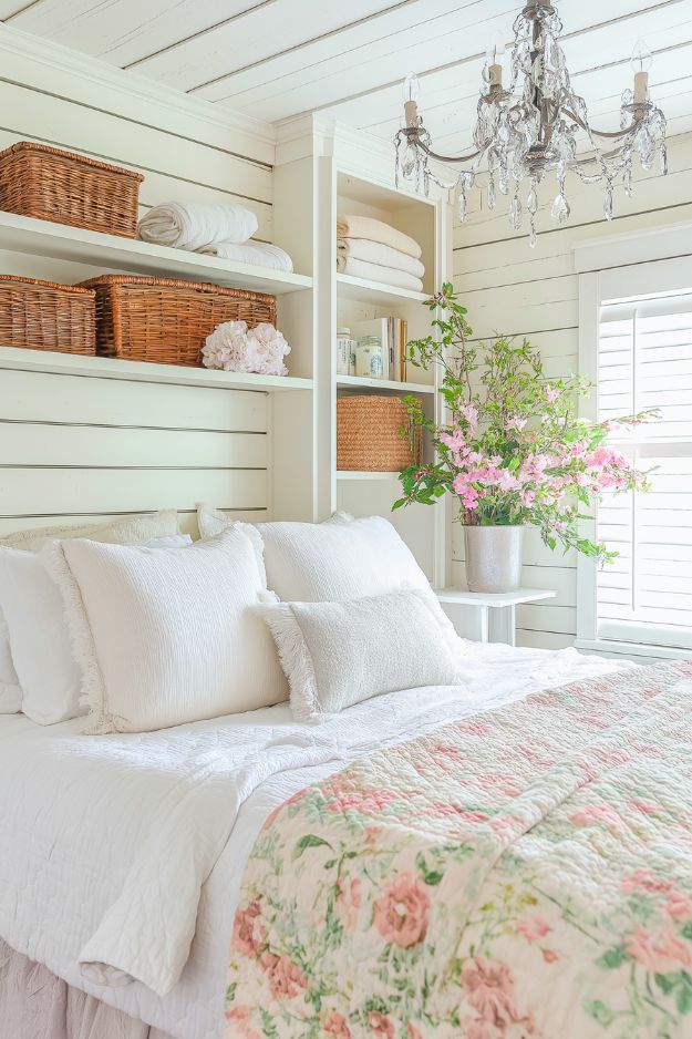 Everything about this room feels like fresh air, the crisp white linens, wicker baskets, and floral quilt, that’s the kind of cottage calm I always chase in spring. The chandelier adds just enough sparkle to keep it from feeling too simple, and that vase of pink blossoms by the window ties the whole space together. It’s the kind of room that makes you exhale the second you walk in.