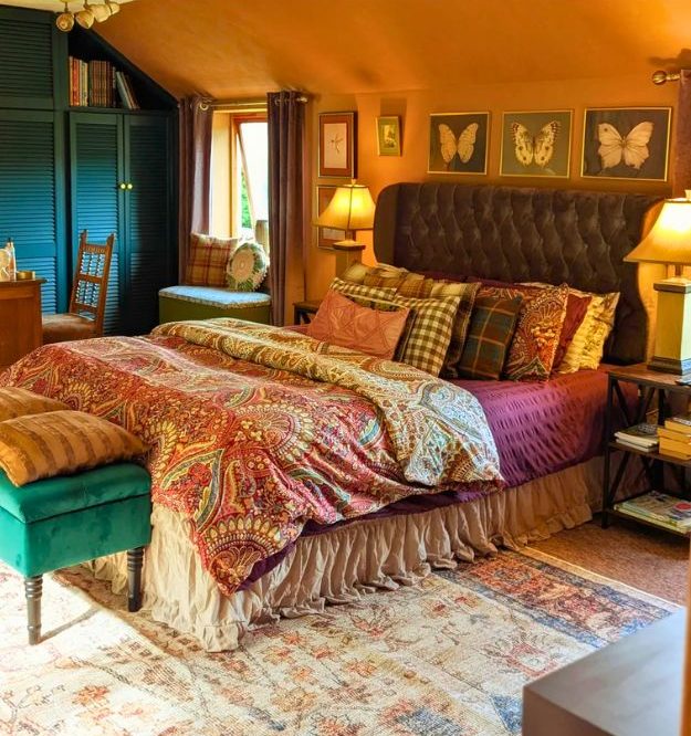 This isn’t your typical cottage bedroom, and that’s exactly why I love it. The rich colors, bold patterns, and soft lighting make it feel deeply personal, like someone built their own cozy world here. It’s warm, eclectic, and full of character, the kind of room that feels lived-in and loved rather than styled for show. Great job from ohhomelygirl
