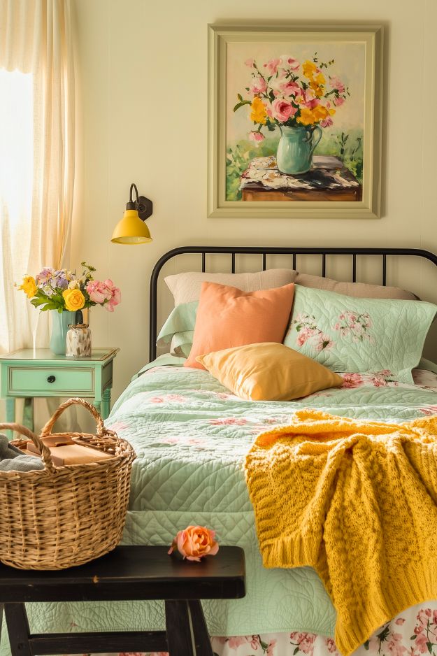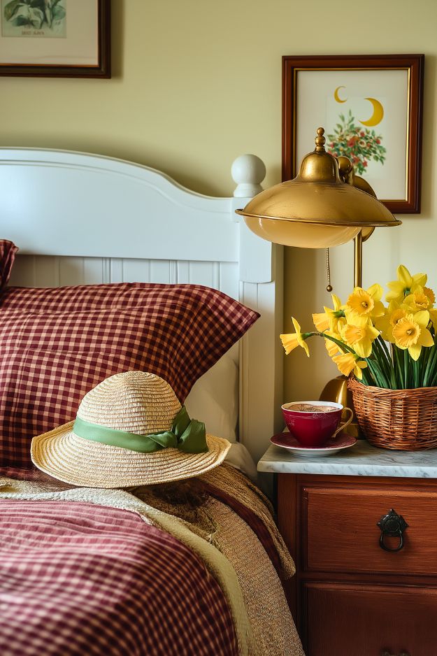 Even if it looks a little styled for the photo, I’d still love to have this setup in my own room. The gingham bedding, straw hat, and basket of daffodils make it feel like spring walked right in. It’s cheerful, tidy, and charming in that effortless cottage way that just makes you smile.