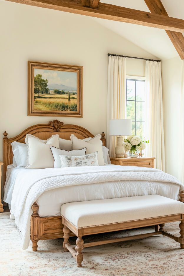 If you want to decorate like this, start with softness, think creamy whites, warm wood, and gentle layers. Skip the clutter and let texture do the work: quilted bedding, linen pillowcases, maybe a ruffled edge or two. Add a few tulips or branches in a vintage vase, and you’re done.