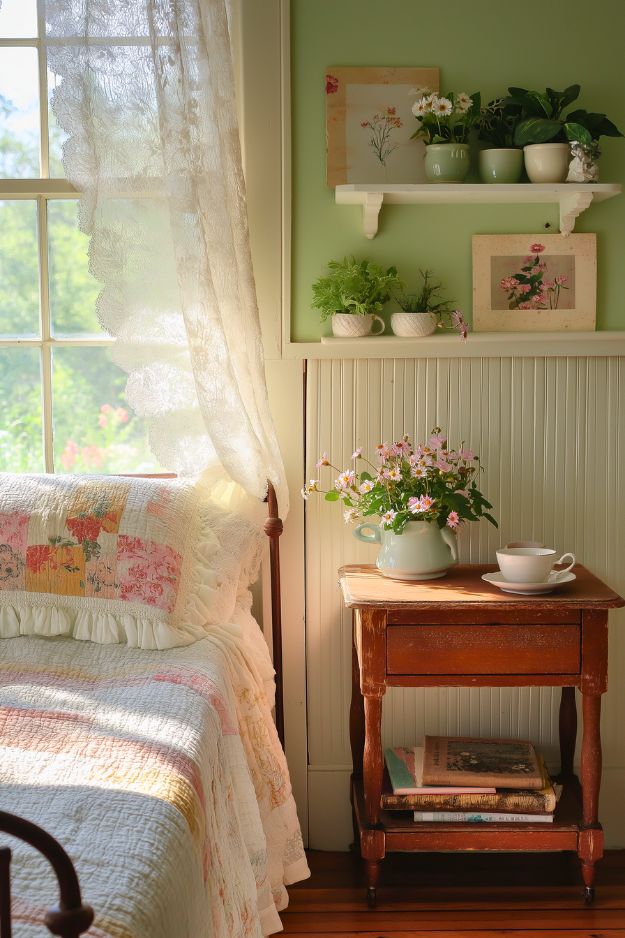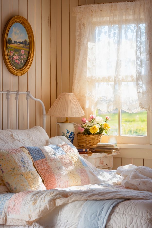 Having a cottage bedroom like this feels like a dream. The dainty floral pillow, lace curtains, and that little basket of spring blooms make the space impossibly soft and inviting. It’s the kind of nook that pulls you in to read a few pages, and then never leave.