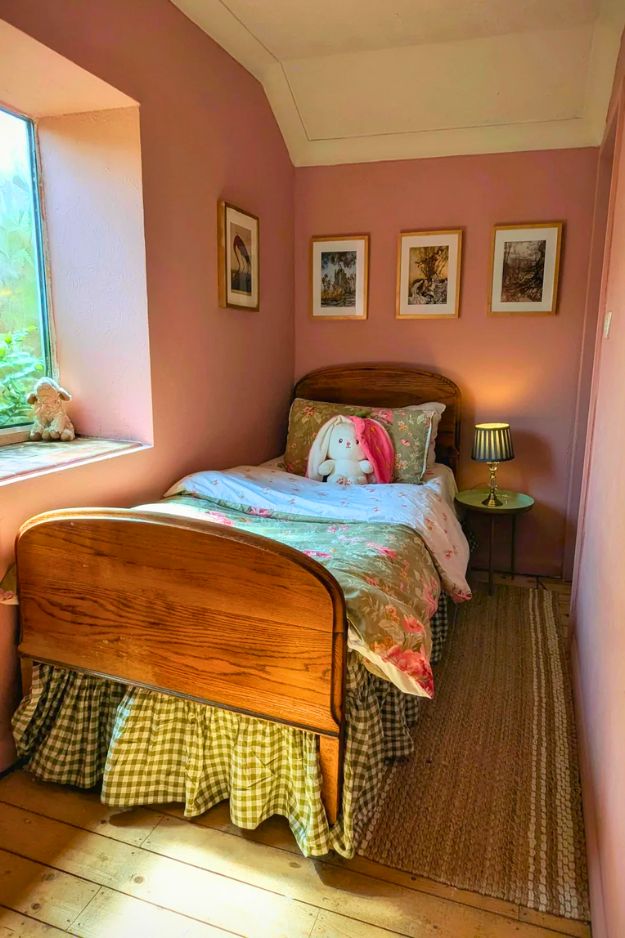 The blush-pink walls (DH Blossom by Dulux Heritage) set such a soothing backdrop, and the green accents give it that fresh spring cottage feel without going overboard.