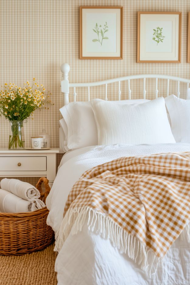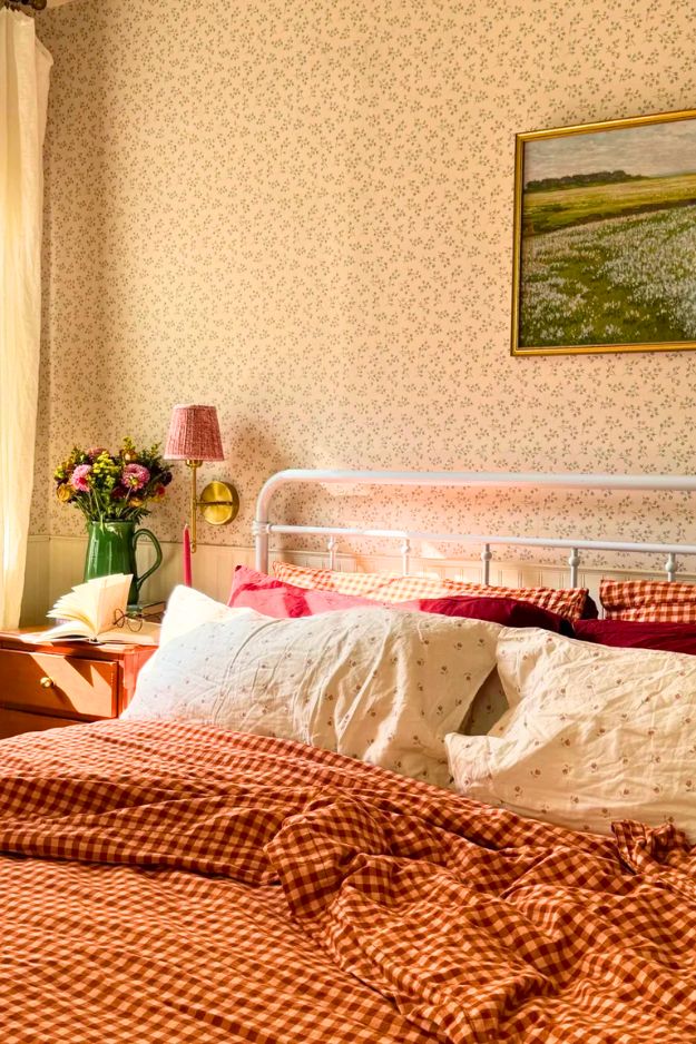 Although this one leans more autumn, I can easily picture it blooming into spring. Keep the gingham, it adds that timeless cottage comfort, and just bring in a few pastel blooms to freshen things up. If I were decorating my own spring bedroom, I’d steal this exact setup for its warmth and perfectly lived-in charm.