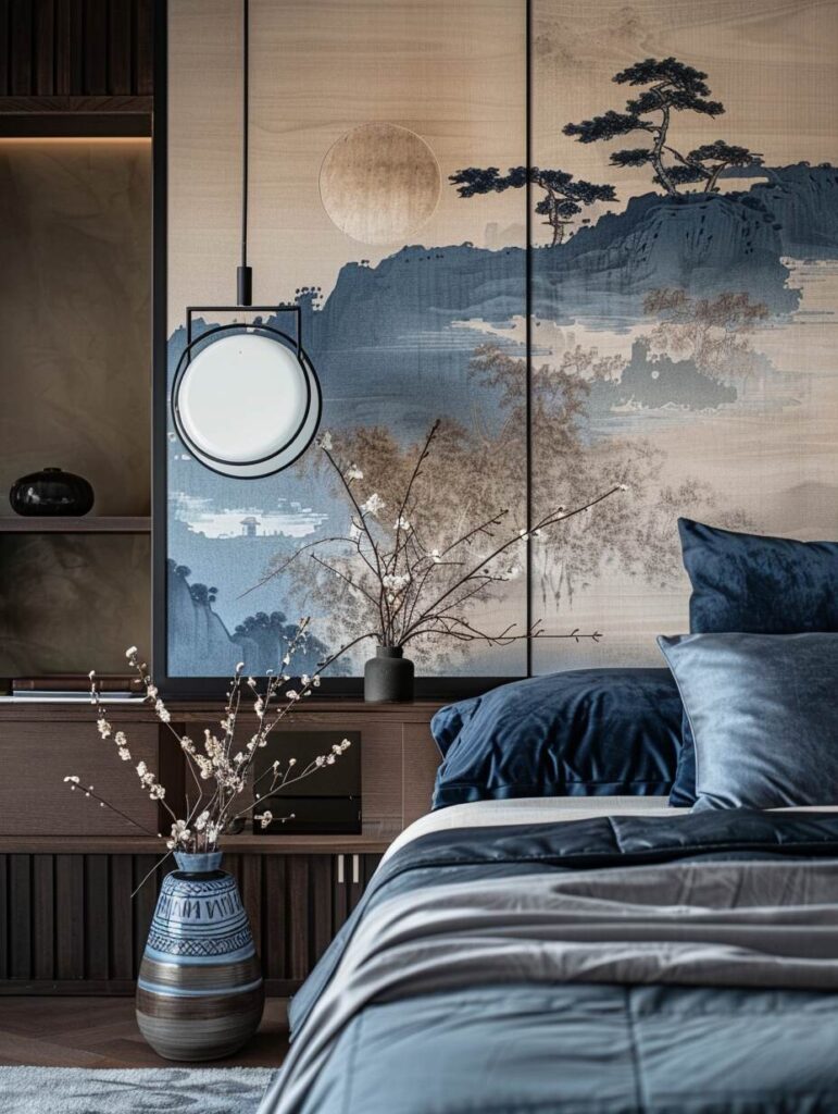 Japandi bedrooms usually lean neutral, but adding a soft color like pale blue can give the space a cooler, lighter feel without stepping outside the style.