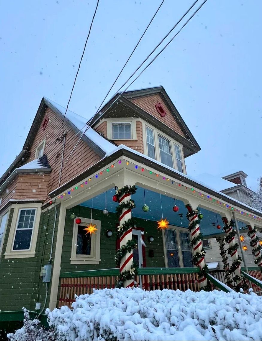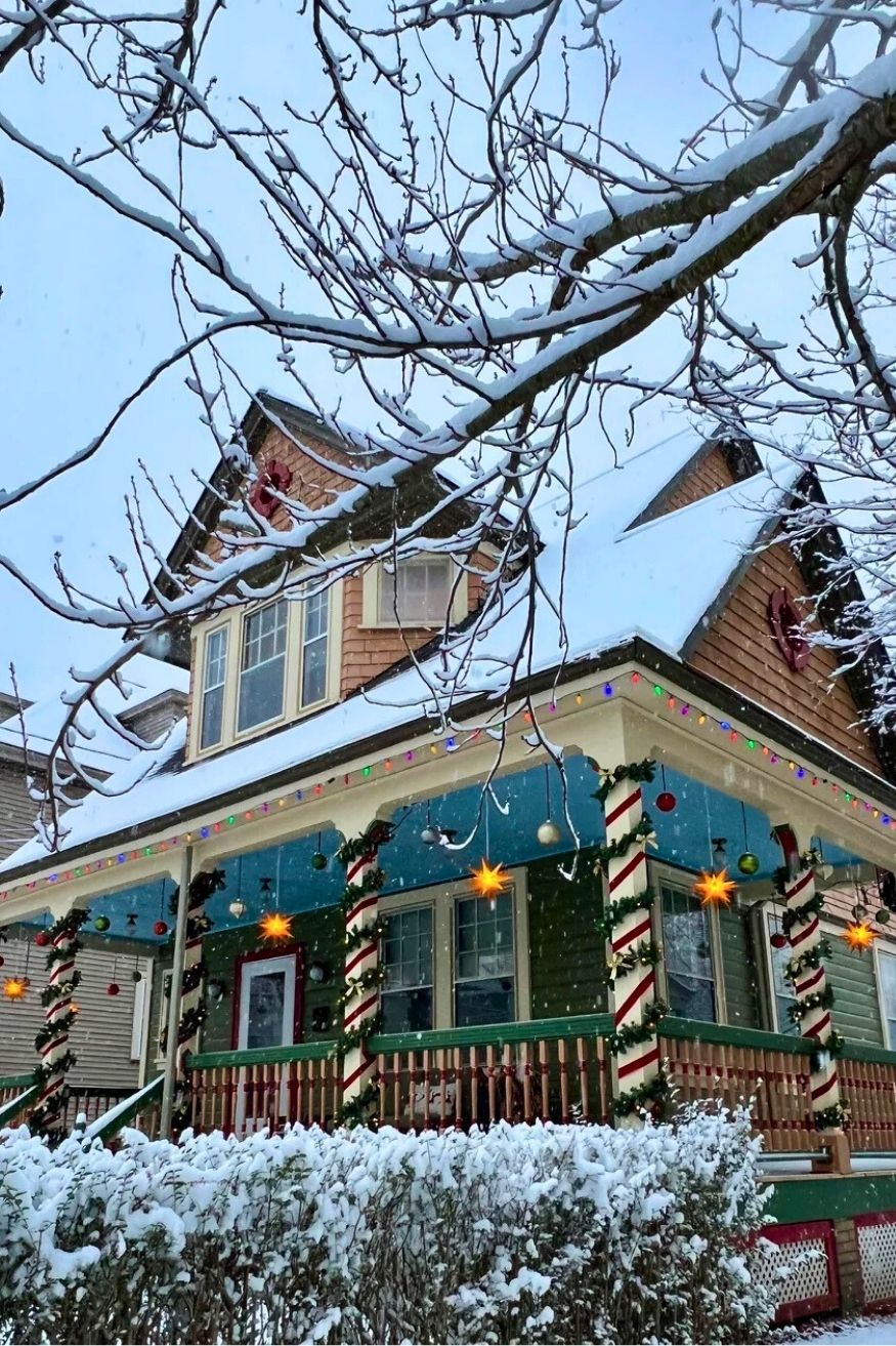 What really charms me about this porch is how it leans fully into that gingerbread-house fantasy without ever tipping into anything gimmicky. The rebuilt porch, painted tin ceiling, and those subtle red and green accents feel thoughtful rather than loud.