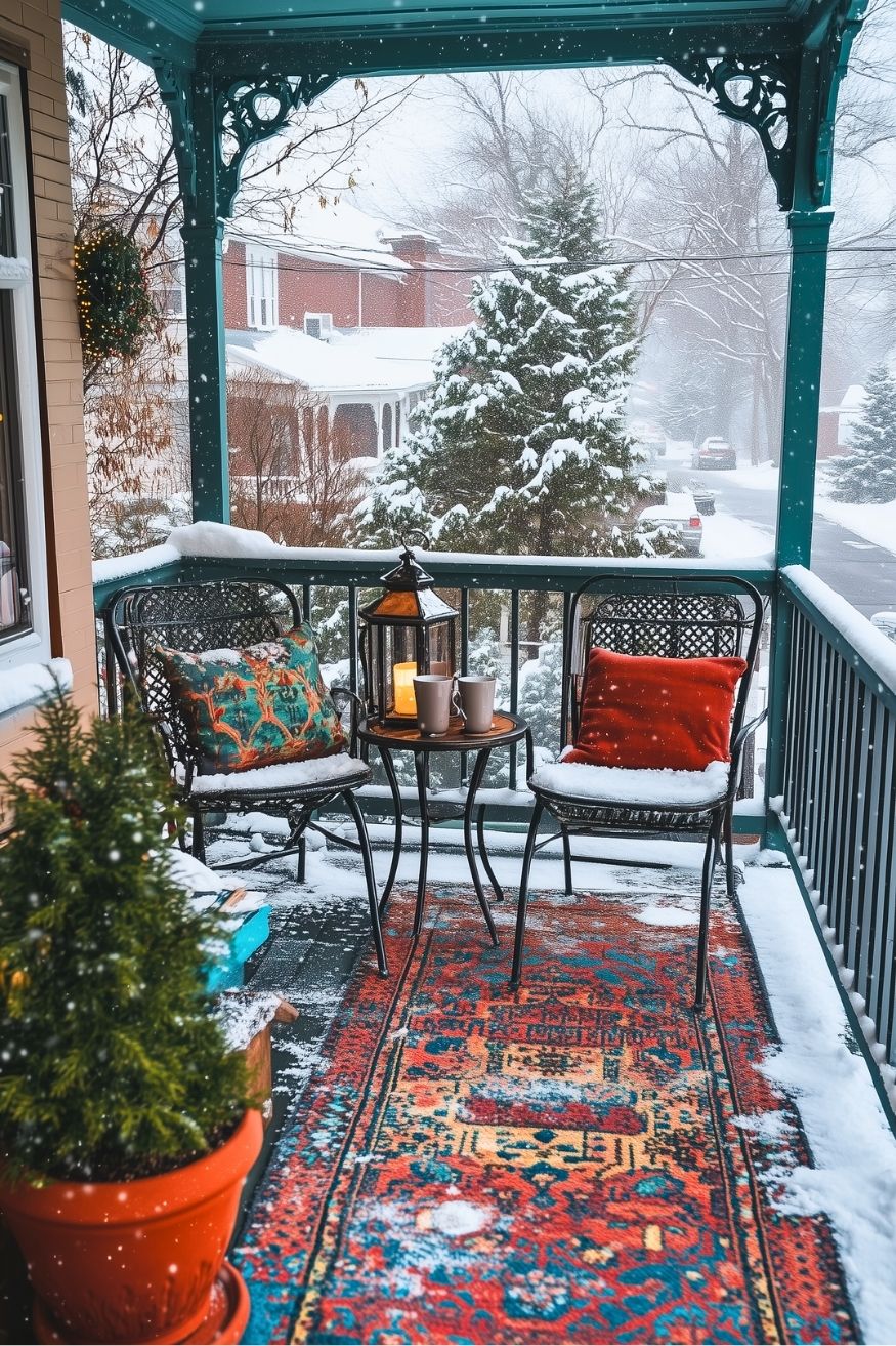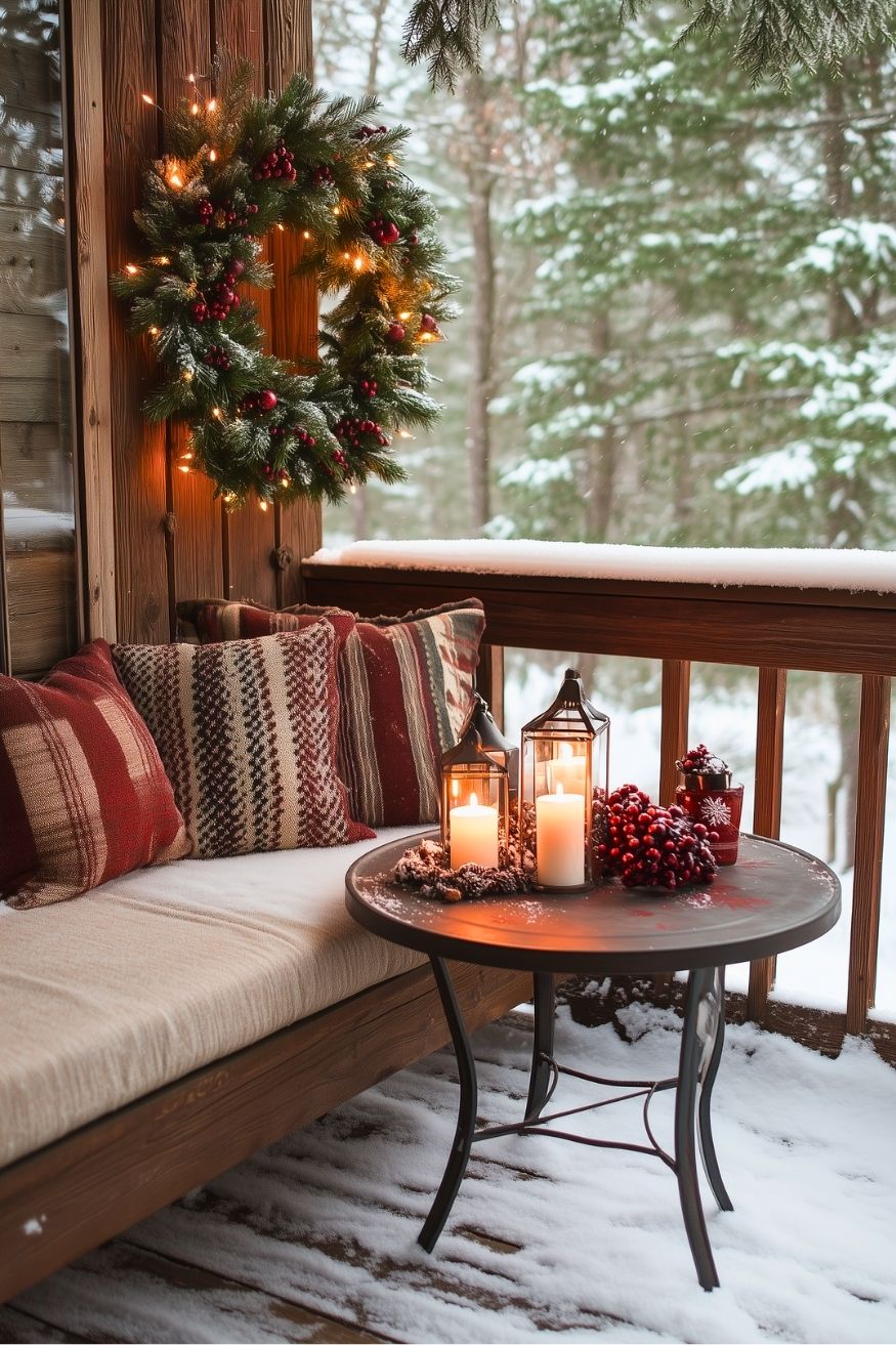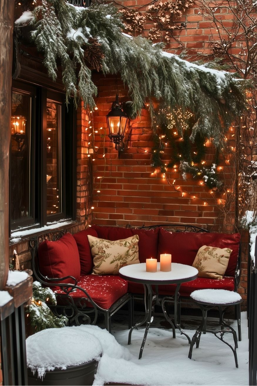 Here’s another idea with a bold and vibrant color scheme for your porch this winter. The little brick-side nook feels like stumbling into a secret winter café. The deep red cushions, the soft candle glow, the snow-dusted table. All together create a quiet, tucked-away charm that you don’t get from bigger outdoor setups.
