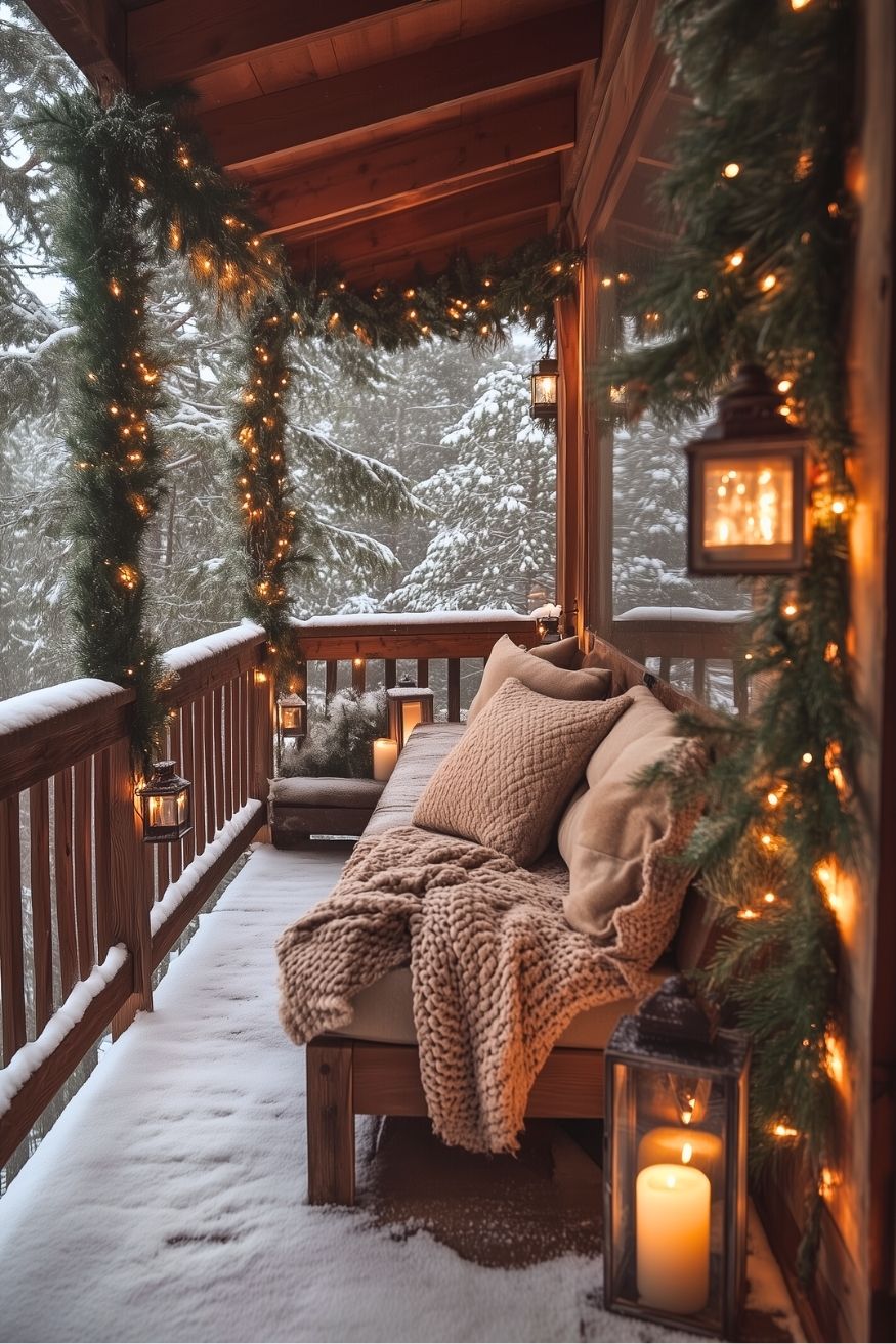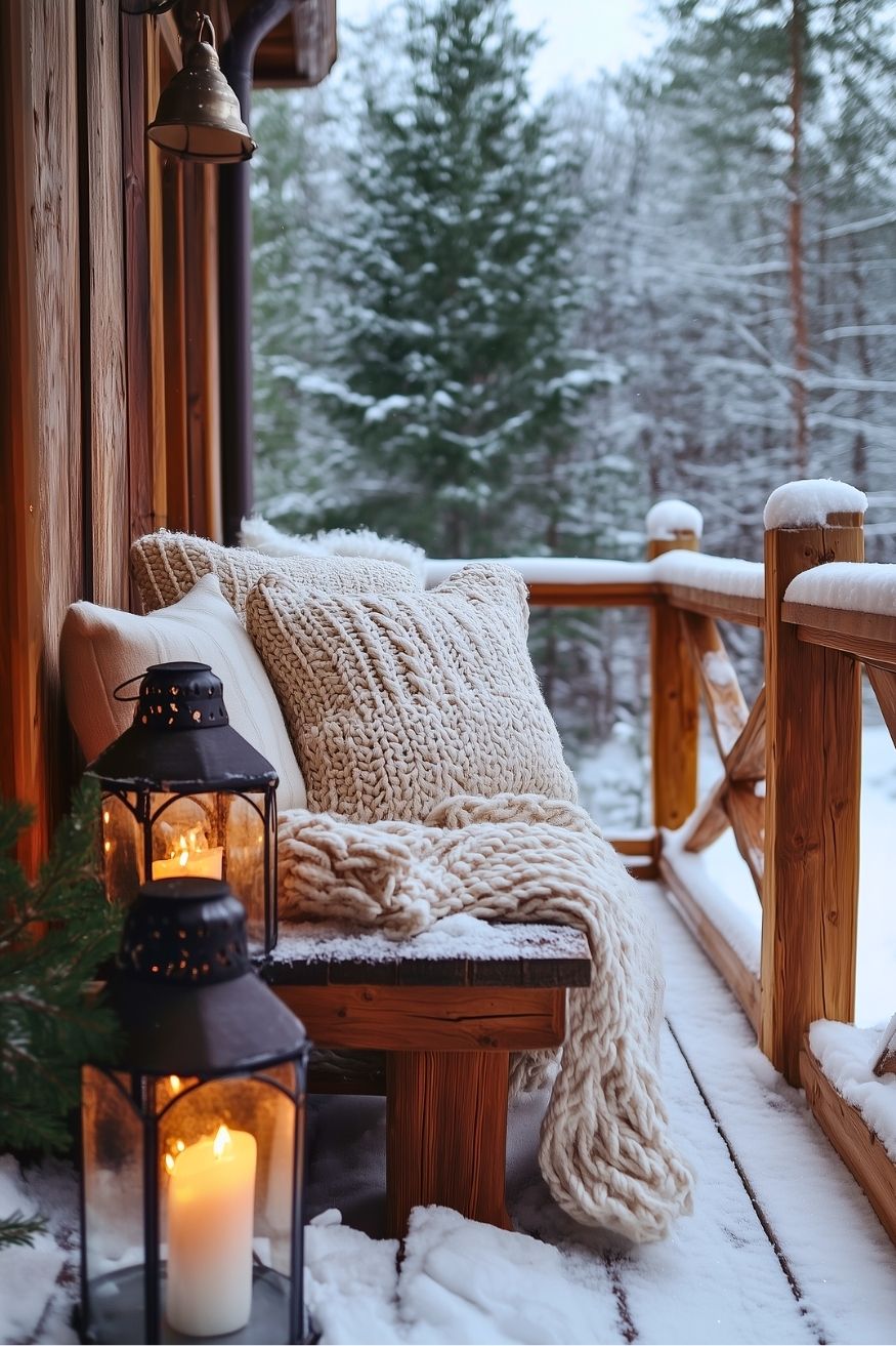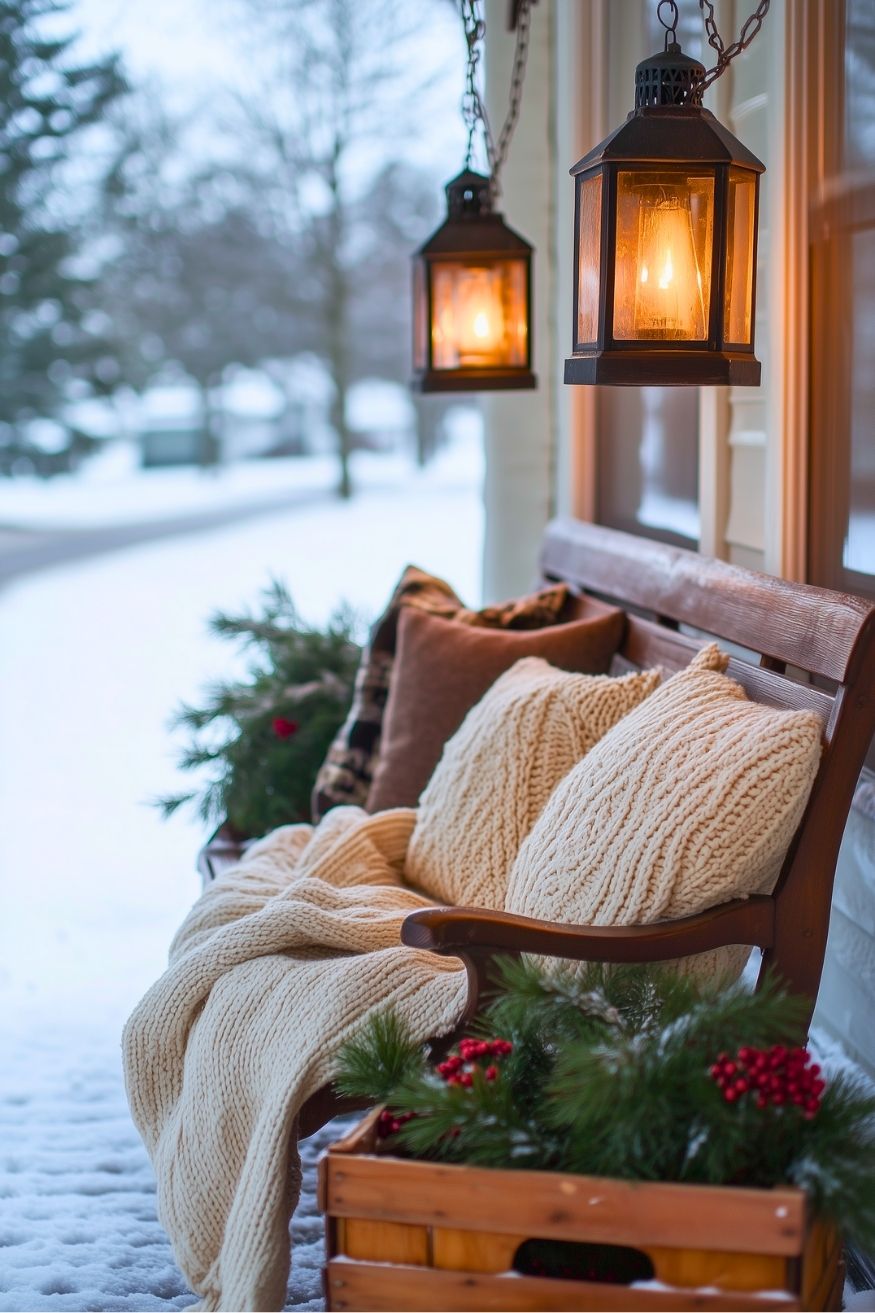 How about this one? A decoration with hanging evergreen garlands, the candle glow, and the knitted wool blanket seem to make everything come together in a way that makes the cold feel cozier. Just look how the lantern light bounces around the porch, warming up the whole corner even while snow piles along the edge. I am also obsessed!