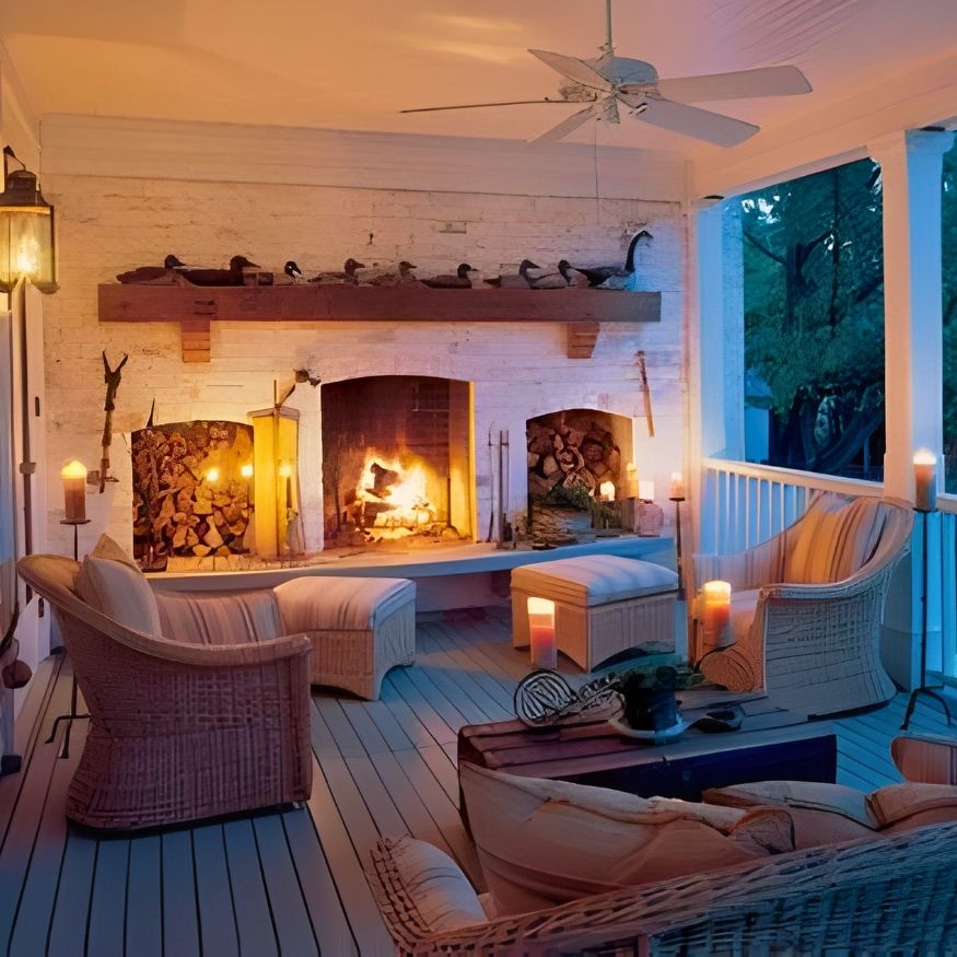 Have you got any ideas for yourself so far? I think this one hits that perfect sweet spot where a porch stops being “outdoor space” and becomes the place you daydream about escaping to. The wood-burning fireplace gives off that crisp, smoky air you can almost smell, and the whole setup feels like you could settle in with a blanket and never bother going back inside.