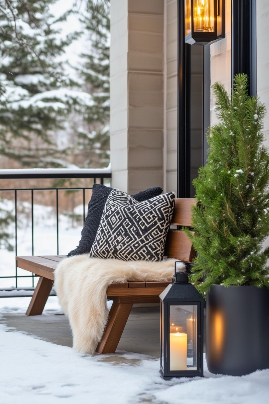 This little corner feels like winter done the modern way. The clean lines of the bench and lanterns keep everything looking sharp, but the faux fur throw instantly softens it and makes the whole space feel warmer than the temperature outside. Then, the small evergreen in the matte pot is such an easy touch, just enough greenery to feel festive but not fussy.