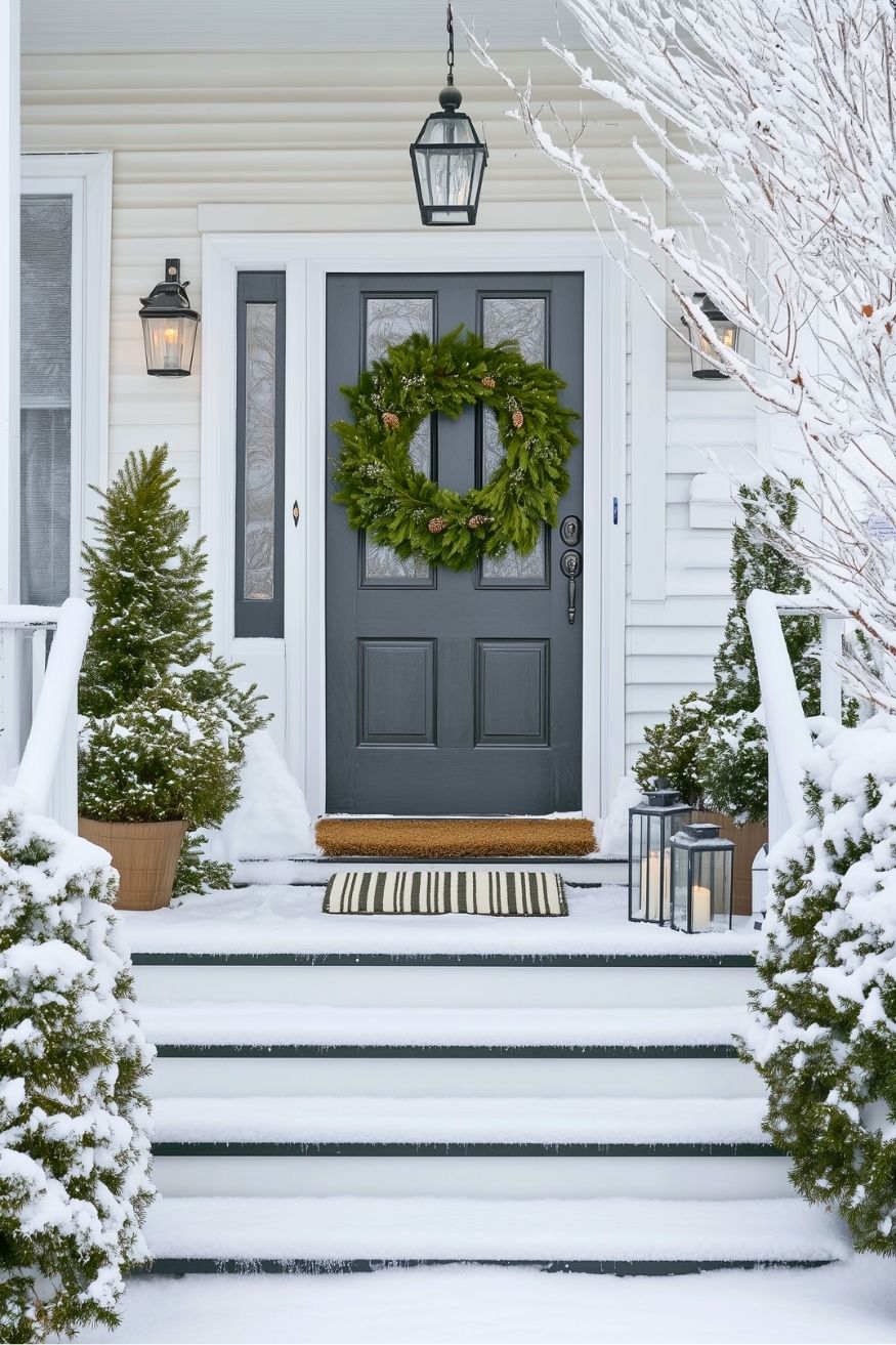 Even if your porch isn’t big enough for a couch or a table, there are so many ways to make it look fancy and cozy this season. This one feels crisp and calm, with that deep charcoal door grounding all the fresh white snow. The lanterns, the wreath, they’re doing the quiet, cozy work of making the steps feel warm before you ever step inside.