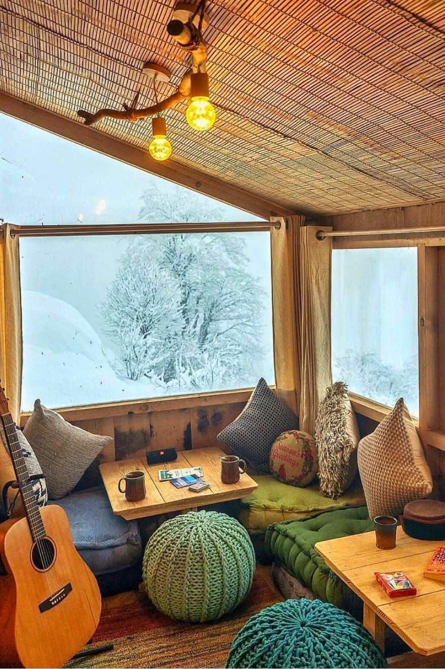 And we’ve come so far to the last one. This idea will give you a gentle and soft feeling in this cold weather. The soft green cushions feel fresh against the snowy backdrop, and the row of potted plants adds just enough life to make the cold feel less harsh. I think it will be a setup where you’d sit for a few minutes longer than you planned, letting the stillness of a snowy day settle around you.
