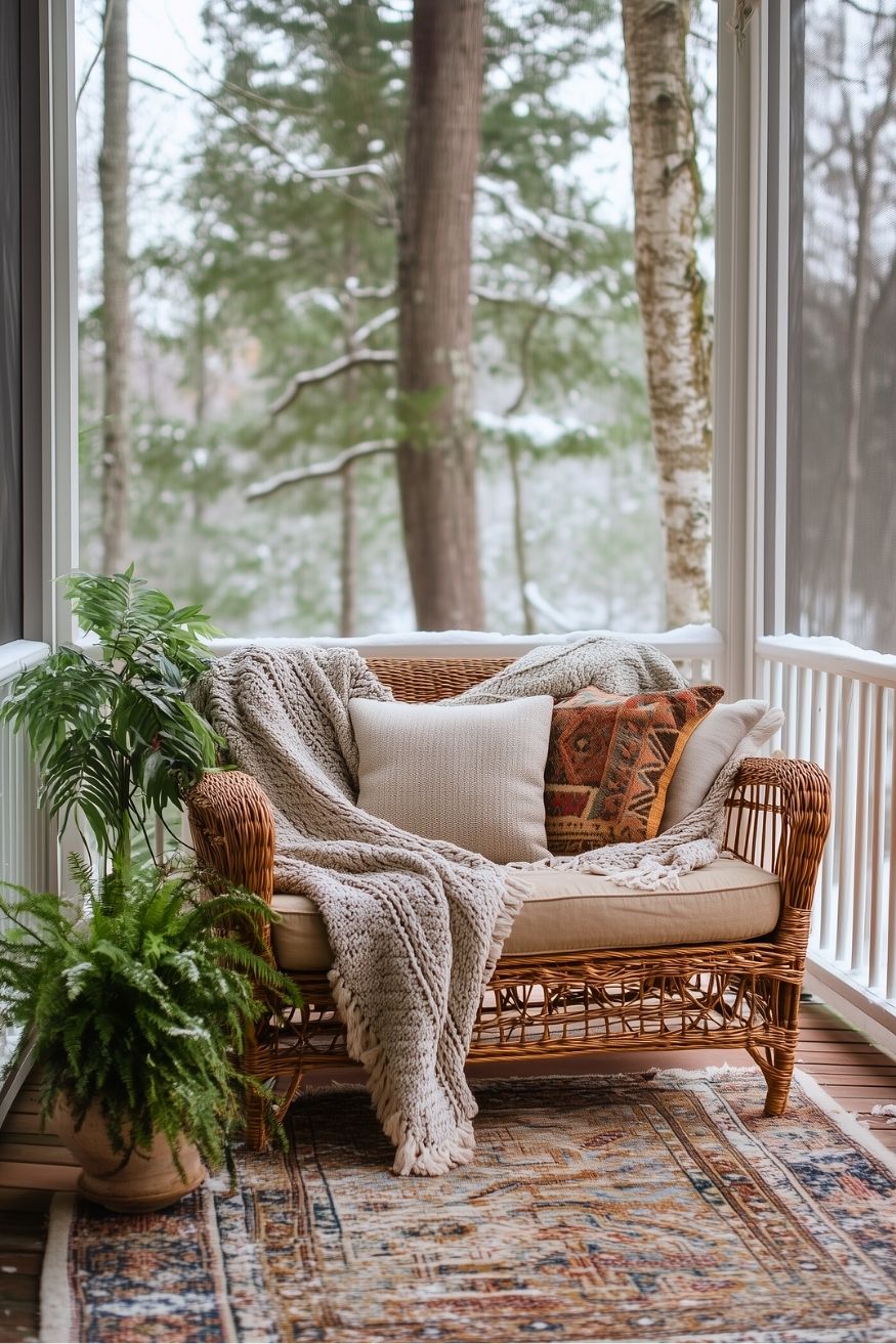 Having this one at the beginning of winter will make your porch look cozier than ever. It’s just like a warm, gentle hug. I’m in love with how the wicker sofa softens the whole space, and the chunky knit blankets make it look like the perfect spot to hide from the cold without actually going back inside.