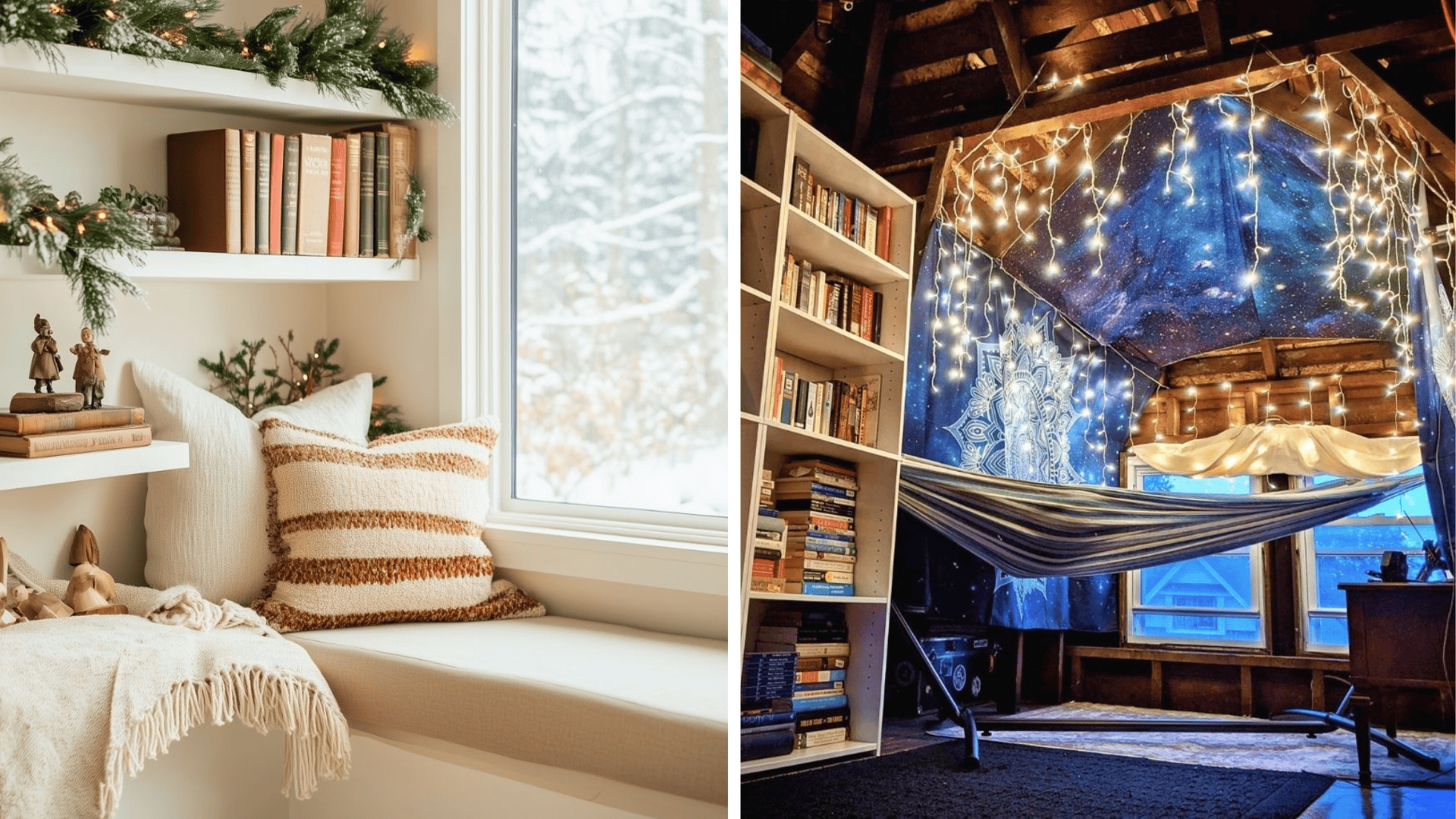 How about having a little bit festive, like Christmas? The warm red pillows instantly brighten the snowy backdrop, and the lit wreath adds that soft glow that makes everything feel storybook-cozy. It’s simple, charming, and also inviting.
