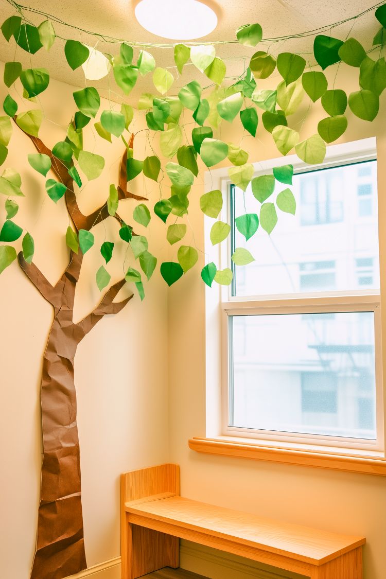 This corner idea is such a lovely way to bring nature indoors. I love the idea of making a paper tree like this in the classroom. It isn’t so difficult to make, with just the brown paper and dangling green leaves, instantly transforming a plain wall into a cozy reading nook or creative corner.