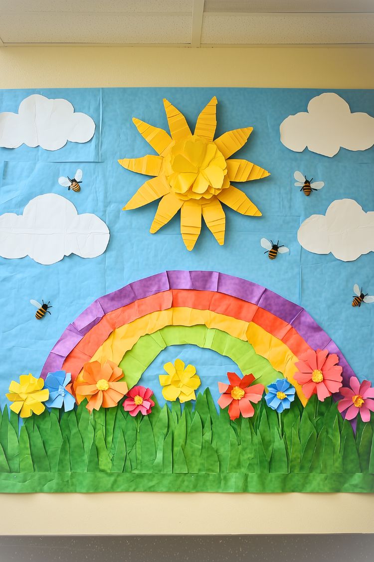 Nothing says spring classroom magic quite like this cheerful rainbow wall. How could we not mention the beautiful rainbow shining in the sky? The bees buzzing around the clouds add the perfect playful touch. It’s a happy reminder that learning can feel just as warm and bright as a sunny day.