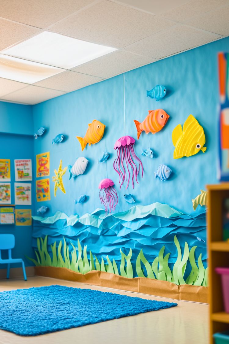 We haven’t gotten any animal theme yet, so why don’t we think about it? This Under the Sea theme brings a part of the ocean into your classroom. I bet this idea will blow a fresh new breeze into your classroom energy and make it more lively. And I personally like handmade seaweed and waves.