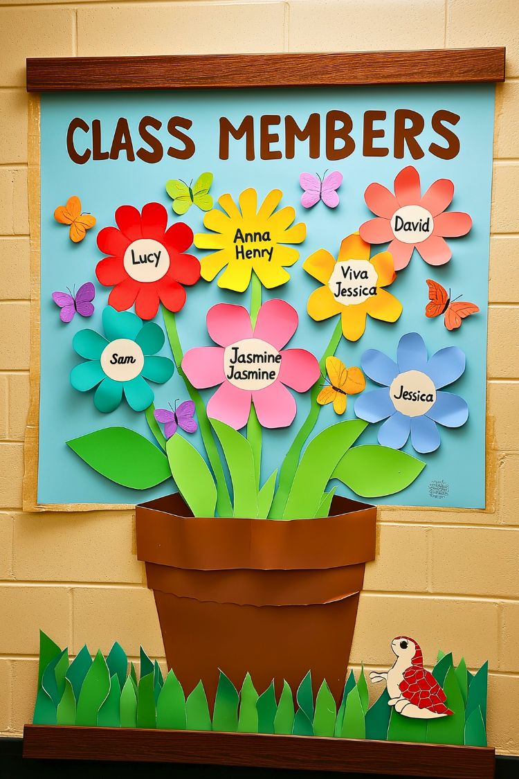 Making a “Class Members” wall is such a bright and personal way to celebrate the students. Each child’s name blossoms from a colorful paper flower growing out of a big brown pot, representing our class. For those who are best friends, you can put their names in the same flower. Why? Because every student is part of something growing and full of life.